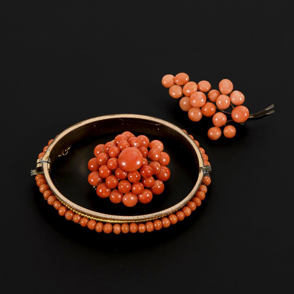 Korallenarmreif und 2 Korallenbroschen um 1900.