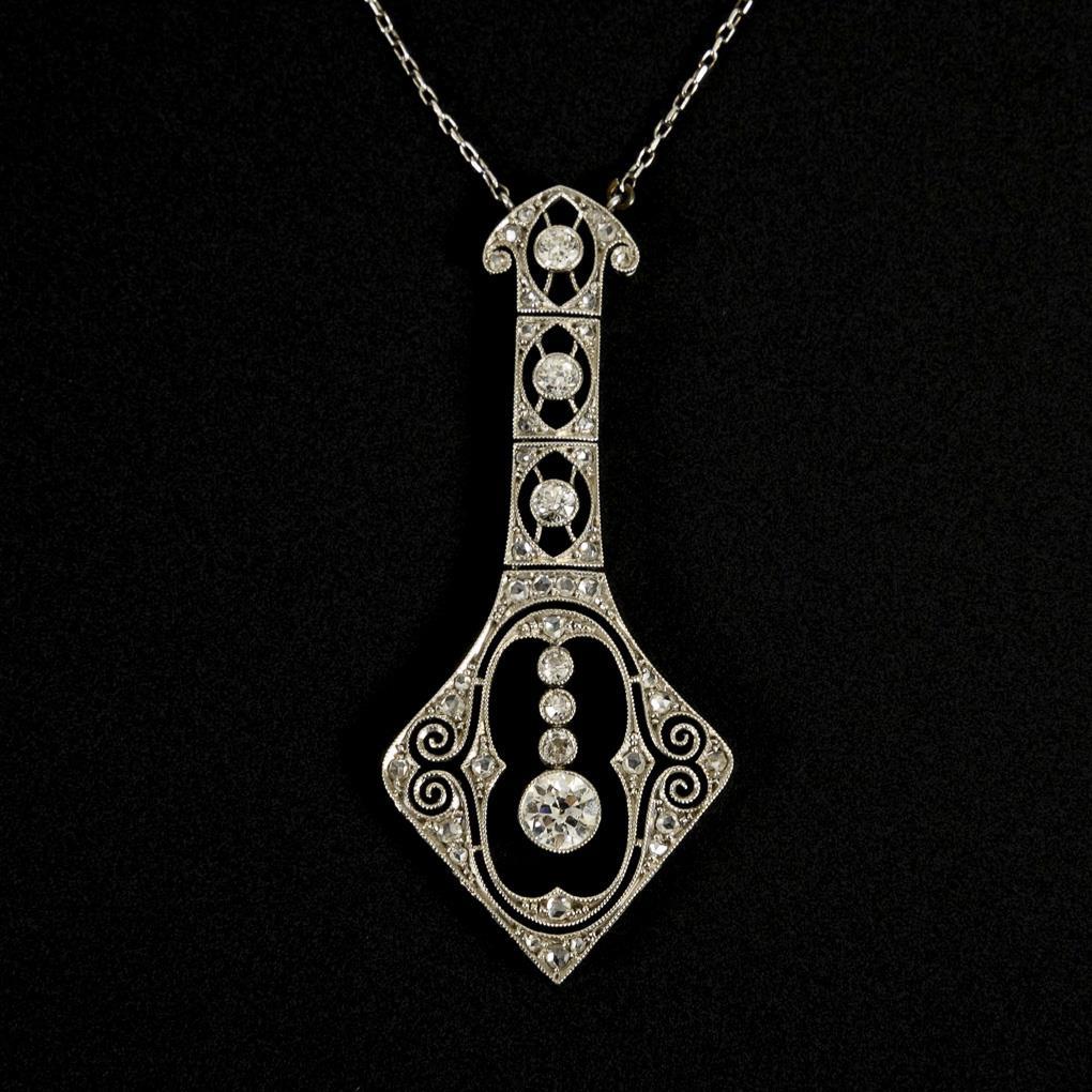 Mehrgliedriger Millegriffes-Anhänger mit 7 zargengefassten Altschliff-Brillanten und 37 kleinen, eingelassenen Diamantrosen. Feine Ankerkette mit Kastenschloss und Achtersicherung.