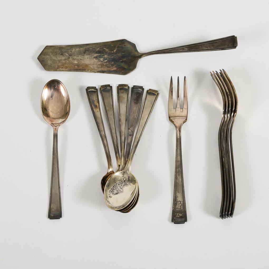 6 Kuchengabeln, 6 Kaffeelöffel und 1 kleiner Tortenheber. In schwarzem Etui.
