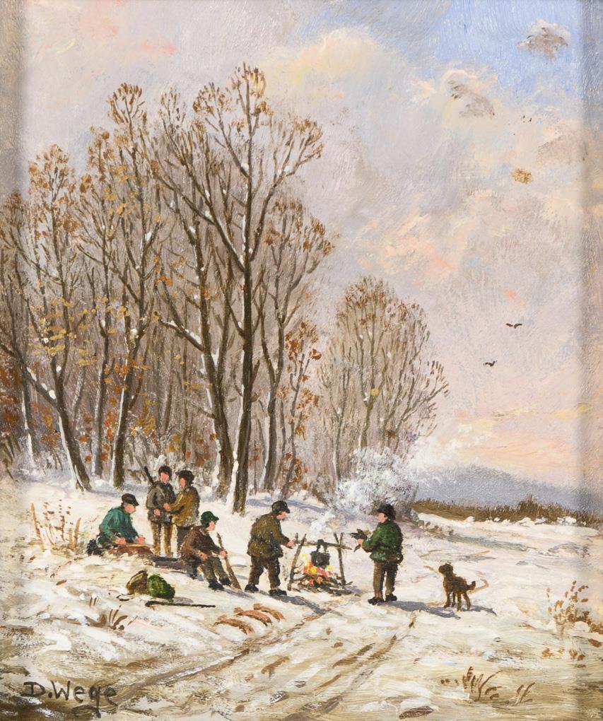 Die Jäger im Winter an einem Feuer nahe dem Wald.