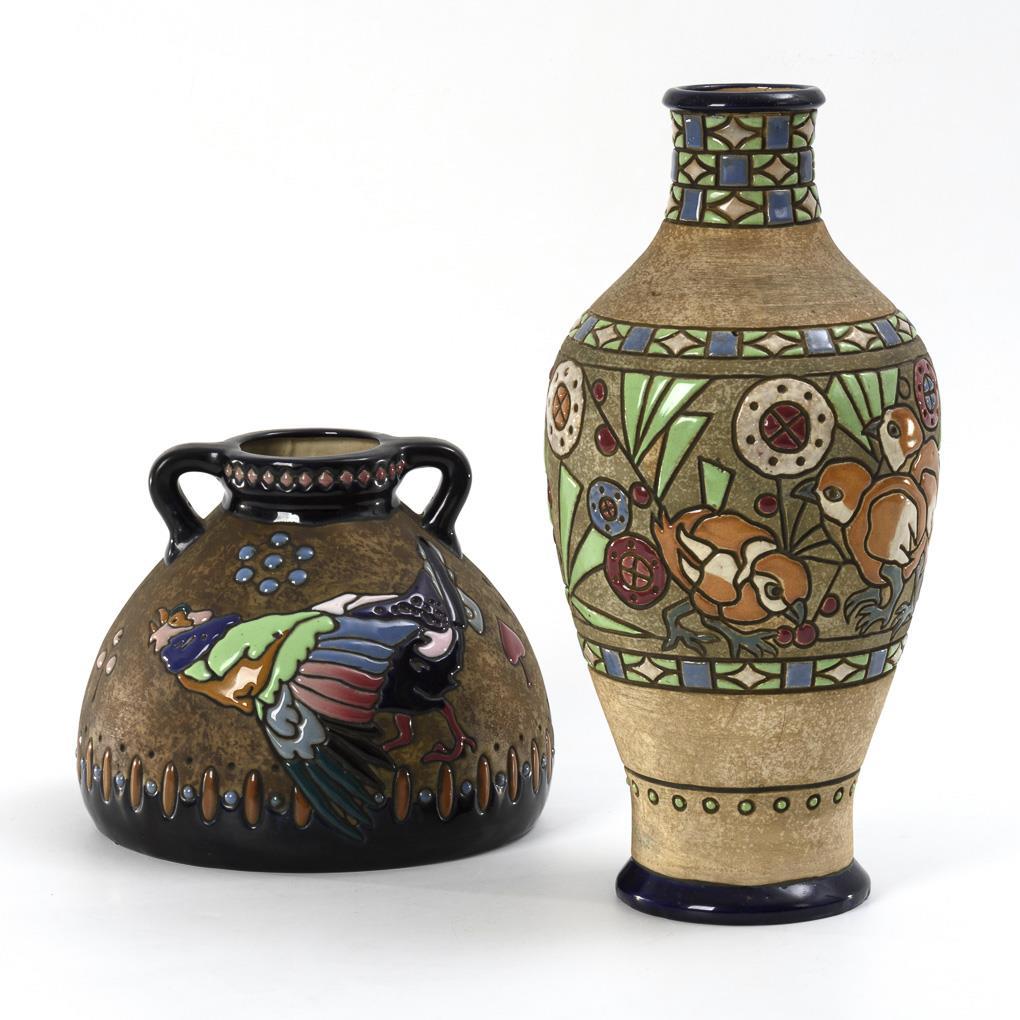 Schlanke Balustervase mit umlaufendem Kükenfries (H 35 cm). Gedrückte, runde Vase mit Enghals und 2 Henkeln, schauseitig ein Auerhahn (H 19 cm).