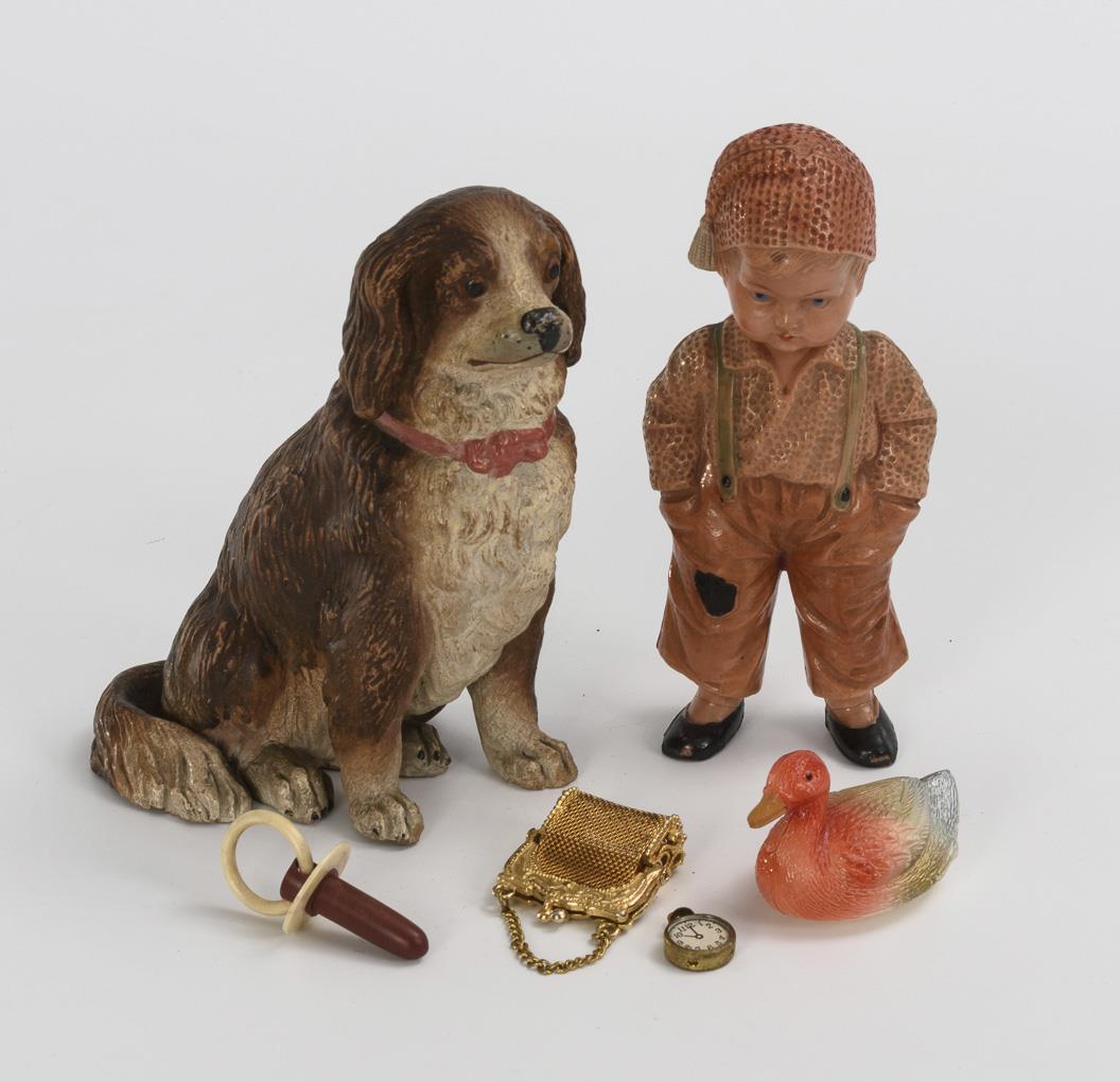 Mit farbig lithografiertem Blech beschlagener Koffer. Darin ca. 7 Kleidungsstücke für sehr kleine Puppen, zahlreiche Schuhe und Strümpfe, sowie etwas Zubehör. Dazu Celluloid-Figur mit Igodi-Kopf, Celluloid-Ente und Keramik-Hund.