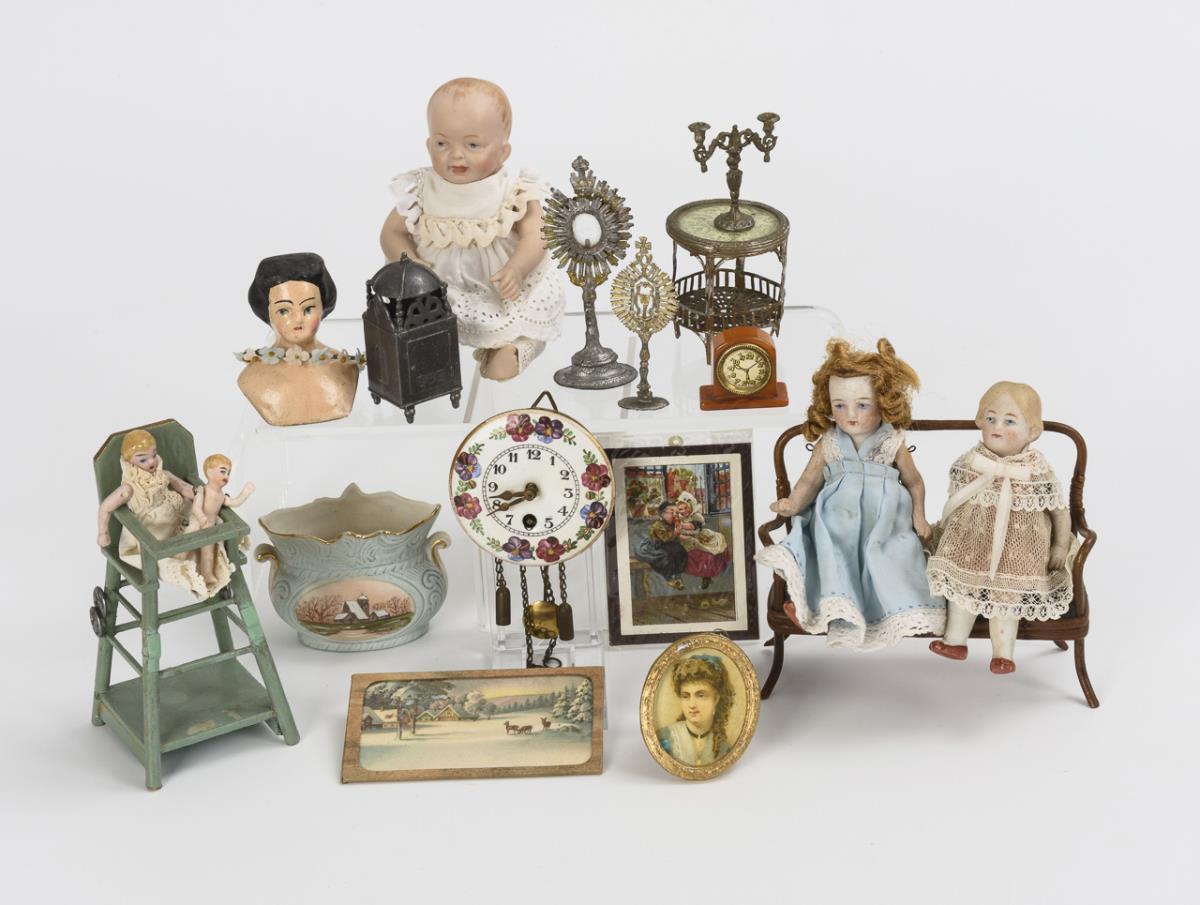 3 Ganzbiskuit-Püppchen, 1 Brustkopf aus Papiermaché und 2 Miniaturpüppchen. Dazu Sitzbank mit blauem Samtpolster, grüner Hochstuhl, Biskuit-Jardiniere, 3 Uhren und etwas Puppenstubenzubehör. Teils mit kleinen Defekten.