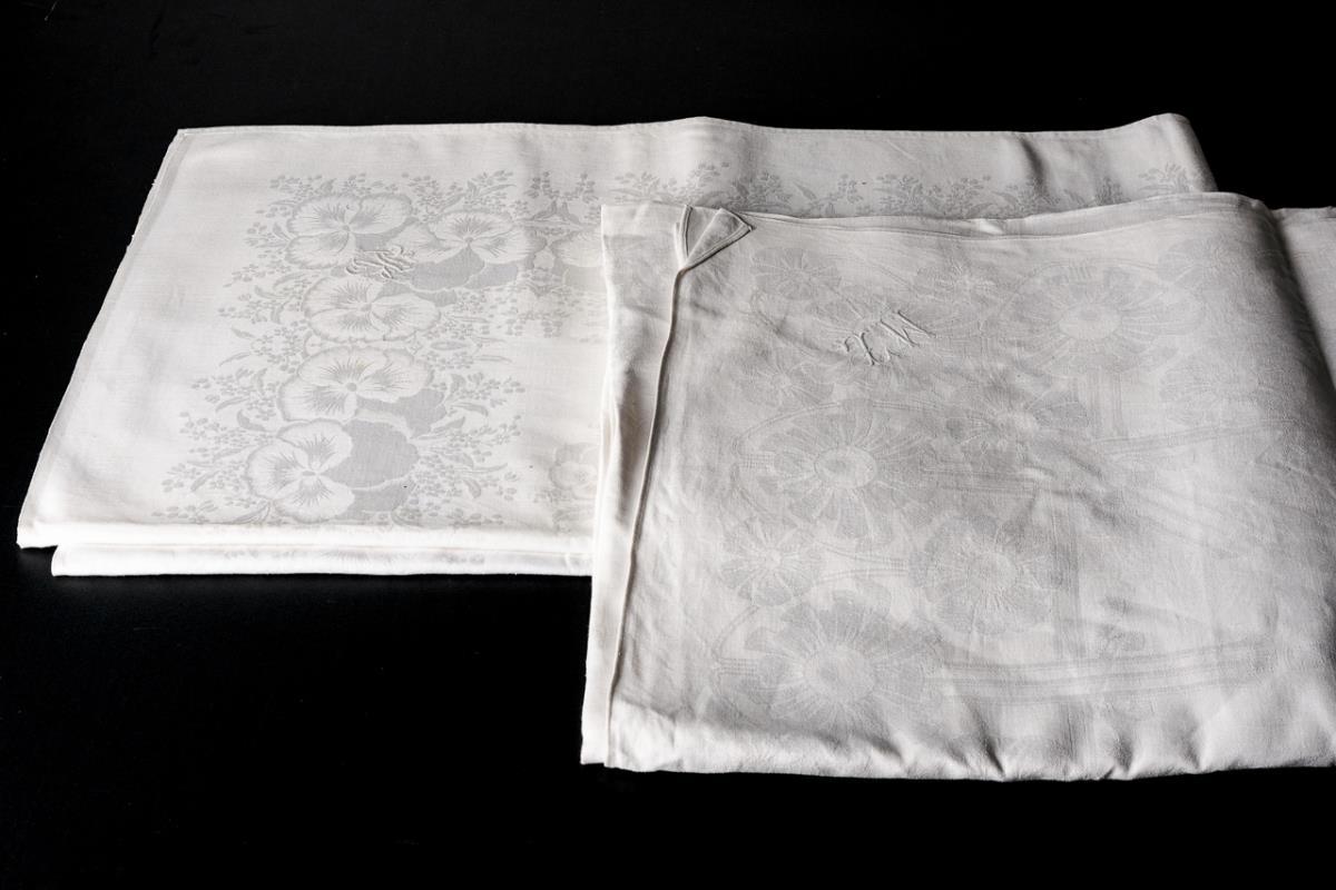 Große Tücher mit Stiefmütterchen- und Mohnblütendekor. Weiße Monogrammstickereien LK/MZ.
