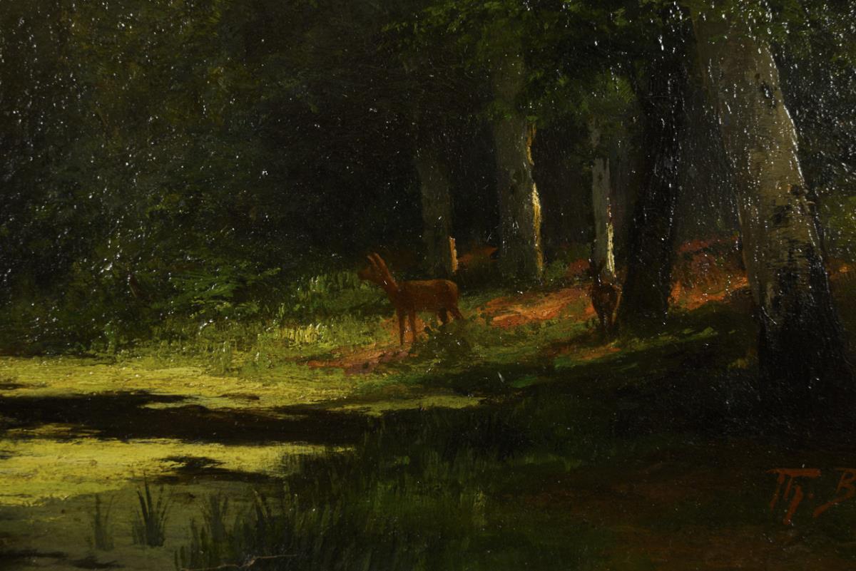 Warmer Sonnenschein über dem kleinen Gewässer mit den Rehen nahe dem Ufer. Leichte Altersspuren.