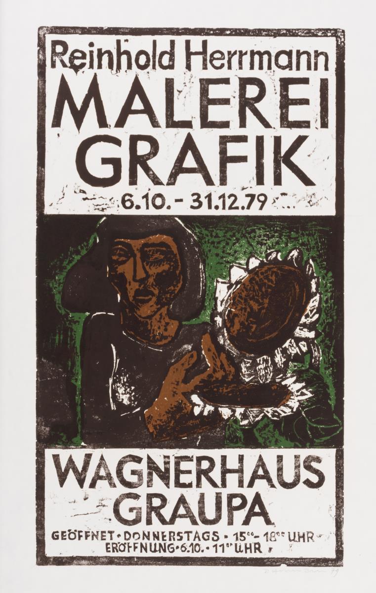 16 Ausstellungsplakate von Künstlern der DDR zu Ausstellungen in Leipzig: Fritz Cremer u.a. - Galerie am Sachsenplatz, Berlin: Gil Schlesinger - Galerie Arkade, 100 ausgewählte Grafiken - Galerie unter den Linden und Angela Hampel - Galerie Eigen+Art, 2 x Potsdam: Michael Horwarth und Angela Hampel - Kleine Galerie "Am Alten Markt", 2 x Karl-Marx-Stadt: Werner Wittig - Galerie Oben und Dress - Club der Intelligenz, Altenburg: Dietrich Burger - Staatliches Lindenau-Museum, Heringsdorf: Matthias Wegehaupt - Kunstpavillon, Freital: Herta Günther - Haus der Volkskunst und Harald Metzkes - Kunsthandlung Patzig, Graupa: Reinhold Herrmann - Wagnerhaus, Heringsdorf, Halle: Rechn - Staatliche Galerie Moritzburg , Meissen: Wolfgang Korn - Stadttheater sowie Bergbaumuseum: A. Timénez u.a. Am Rand teils geknickt und mit kleinen Rissen.