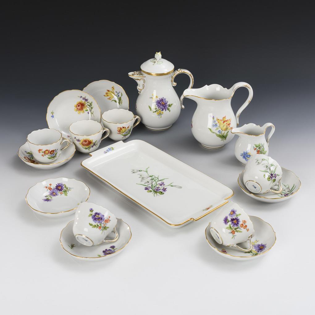 Überwiegend Form "Neuer Ausschnitt". Mokkakännchen (H 16,5 cm), 2 Milchkännchen (H 8 und 13 cm), 6 Mokkatassen mit 7 Untertassen und 1 Königskuchenplatte. Deckelknauf bestoßen, minimale Bestoßung am Kannenstand, 1 Tassenrand und 1 Untertassenrand bestoßen.