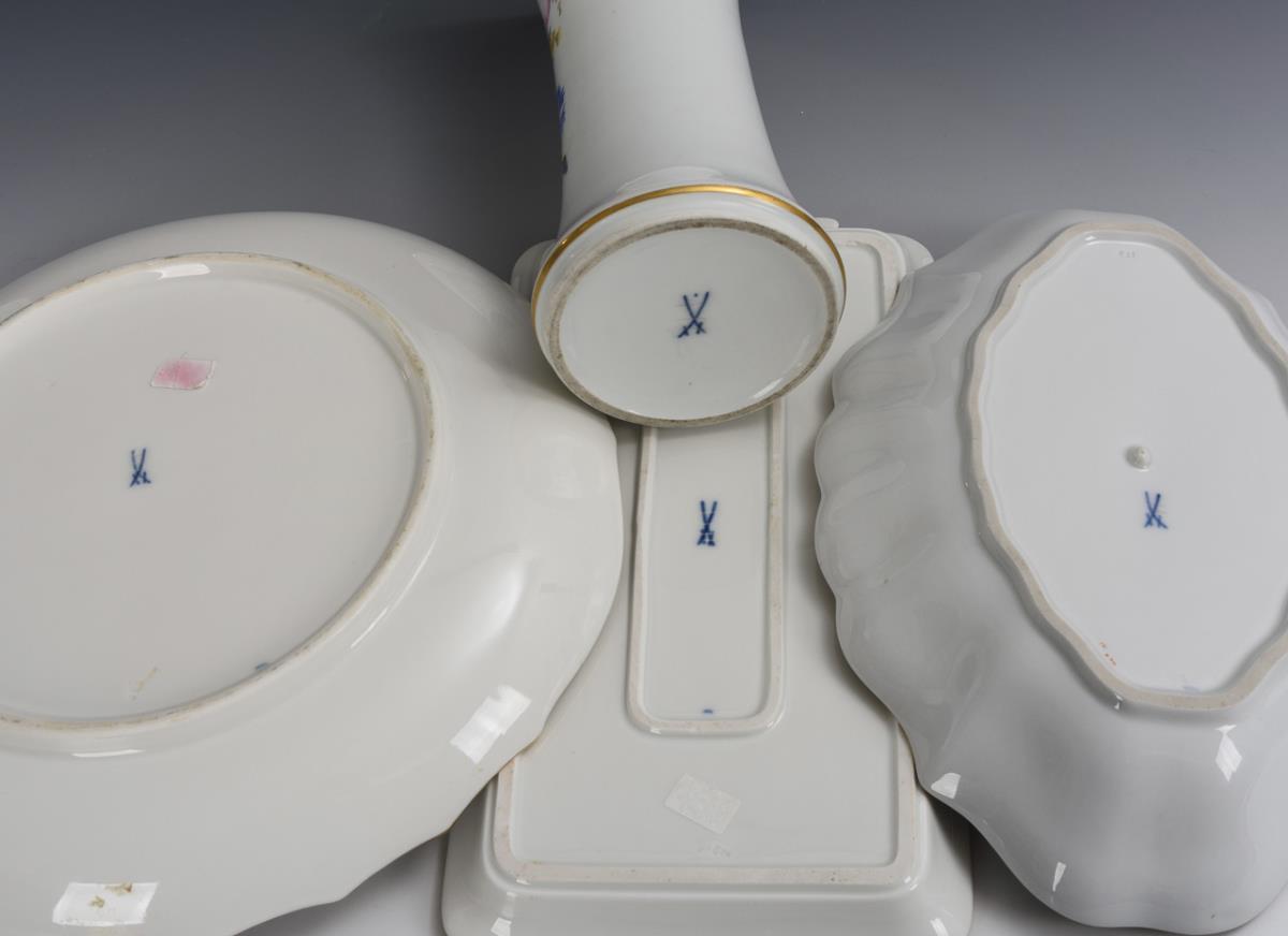 Vase, 2 Schalen und Königskuchenplatte mit Blumenmalerei. Meissen.