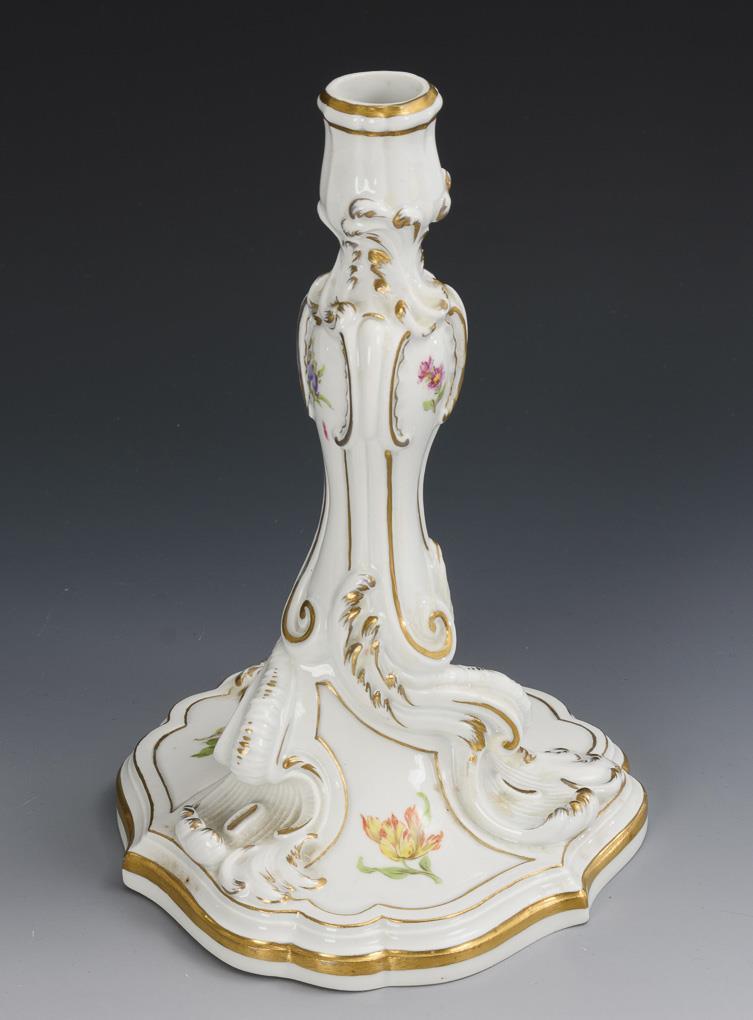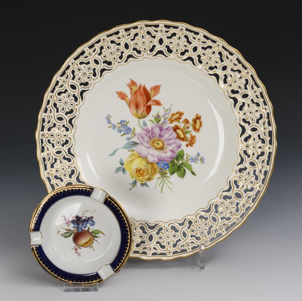 Rocailleleuchter mit Blumenmalerei (H 23,5 cm), Kredenzteller mit blütendurchbrochener Fahne und Blumenbukett (Ø 29,5 cm), kleiner Durchbruchteller mit Blumenmalerei (Ø 15 cm) und runder Ascher mit Kobaltrand und Fruchtmalerei (Ø 12,5 cm).