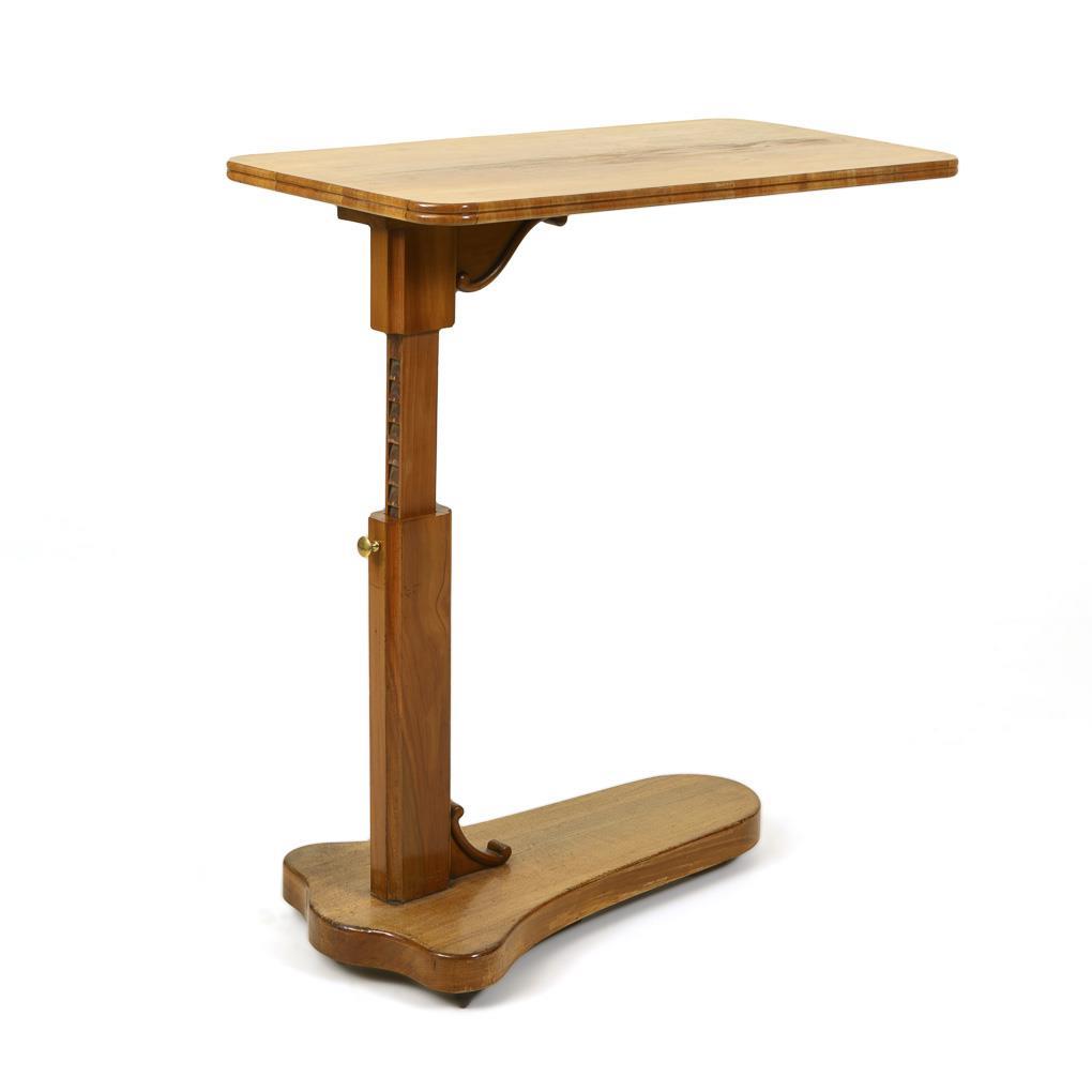Rollbarer, seitlich an ein Bett stellbarer, schmaler Tisch zur Erleichterung des Lesens, Schreibens oder der Nahrungsaufnahme. Rechteckige Tischplatte auf seitlicher Pfeilerstütze und Sockel, individuell höhenverstellbar bis 95 cm. Alters-/Gebrauchsspuren, Trockenrisse.