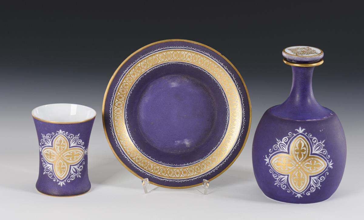 Weißes Milchglas, violetter Fond, Goldstaffage. Karaffe (H 18 cm), Becher (H 10 cm), Teller (Ø 18,5 cm).