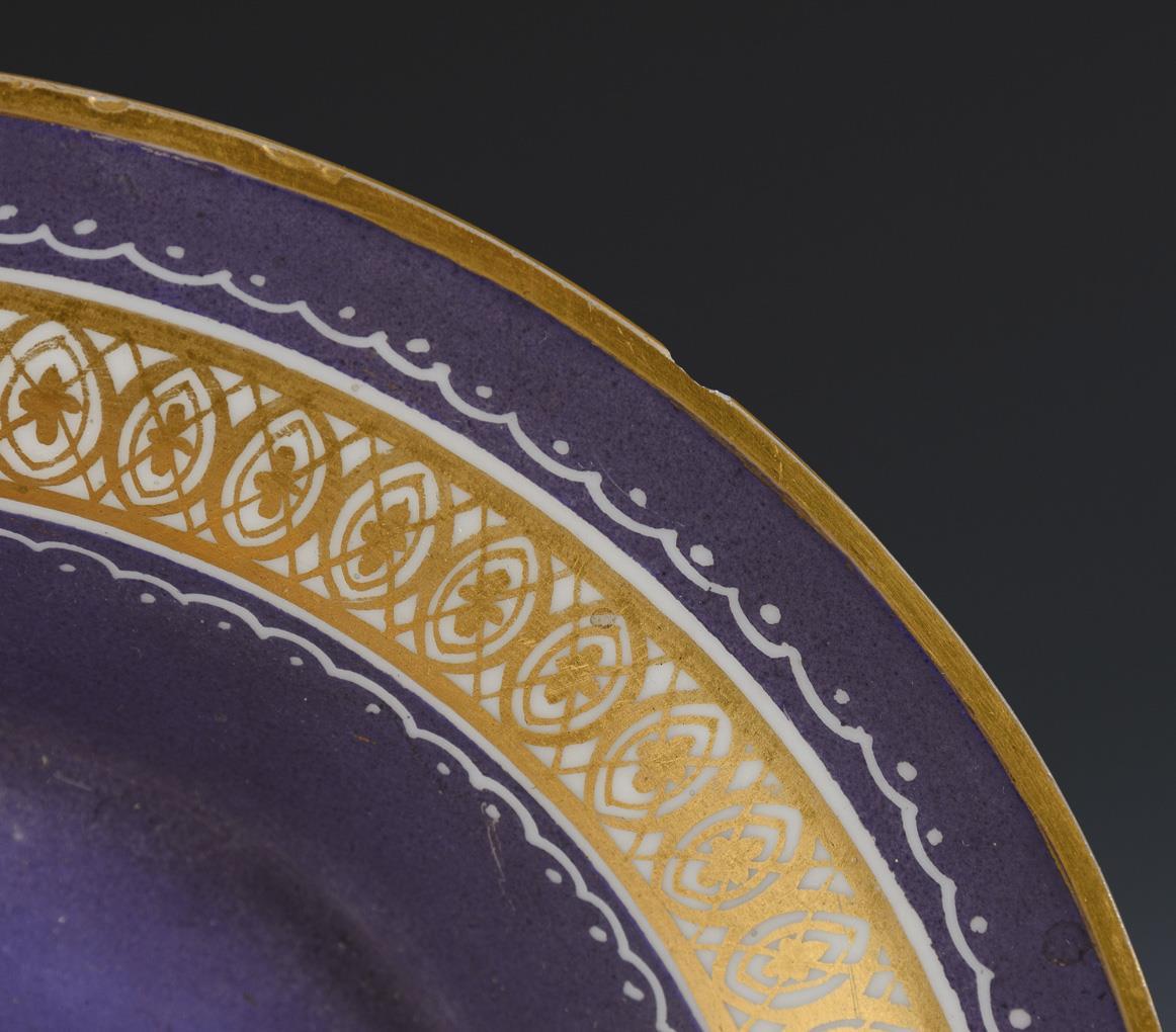 Ovoide Karaffe mit konkavem Nachtglas und Unterteller. Violetter Fond, ornamentale Goldbordüre sowie mythologische Dekorbilder in Grisailleoptik. Partiell minimaler Goldabrieb, Bestoßung am Tellerrand.