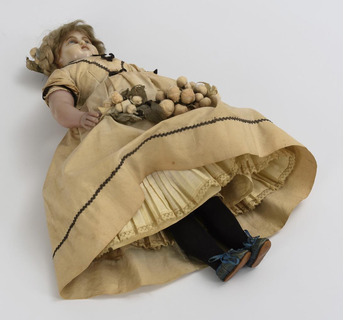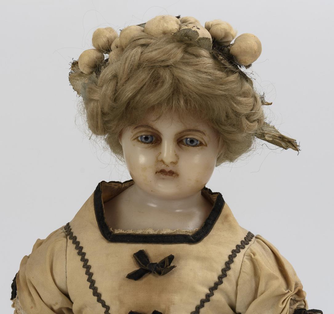 Brustkopf, blaue Glasaugen, blonde Mohairperücke mit Flechtfrisur. Stoffkörper mit Wachsgliedern. Helles Kleid mit Tournure und Girlande mit Watteblüten. Kopf frontseitig etwas verblichen, rückseitig mit Rissen.
