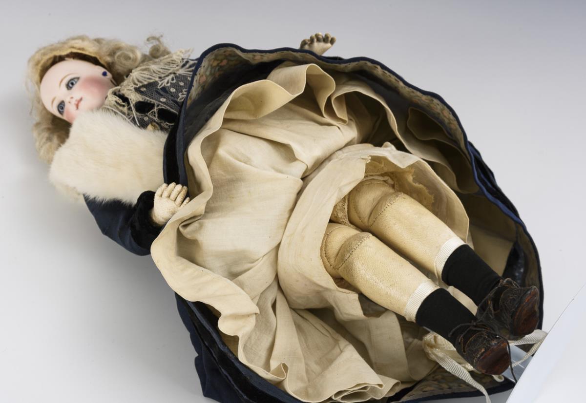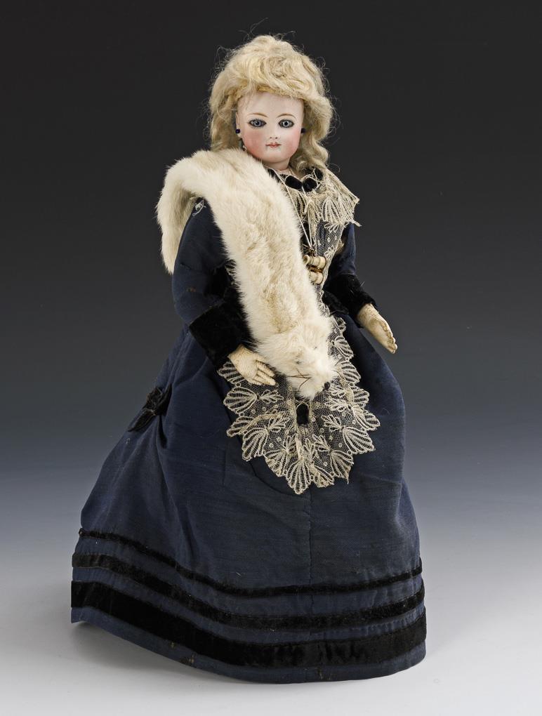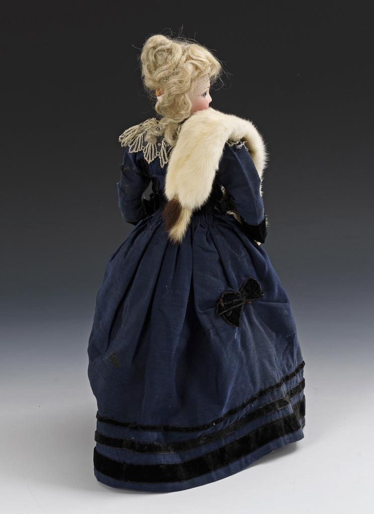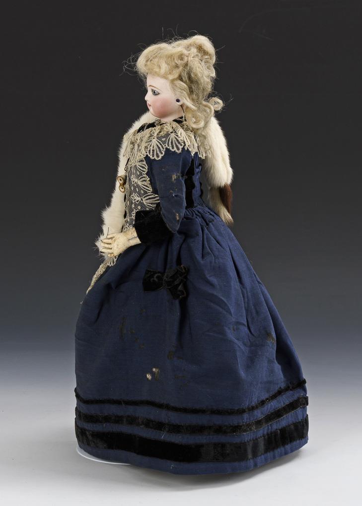 Kurbelkopf auf Brustplatte, feste blaue Glasaugen, blonde Mohairperücke, Ohrringe, geschlossener Mund. Lederkörper mit Zwickel an Po und Knien, Hände mit einzeln abgenähten Fingern. Blaues Kleid, Polarfuchsstola, Opernglas, Handtasche, alte schwarze Schuhe mit Absatz. Kopf durchleuchtet: ohne Defekte, Brustplatte teils verdeckt, Kleid partiell zerschlissen.