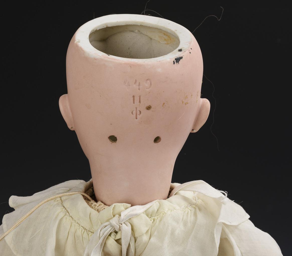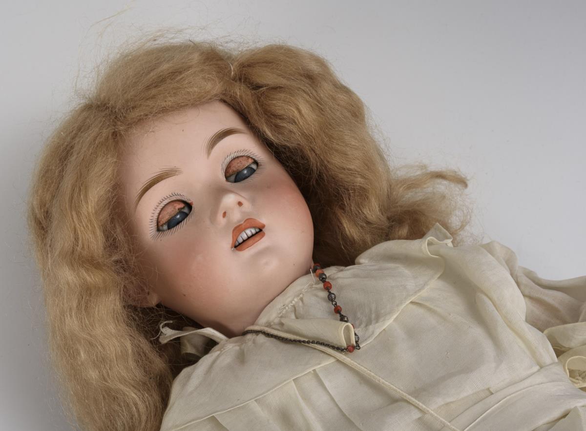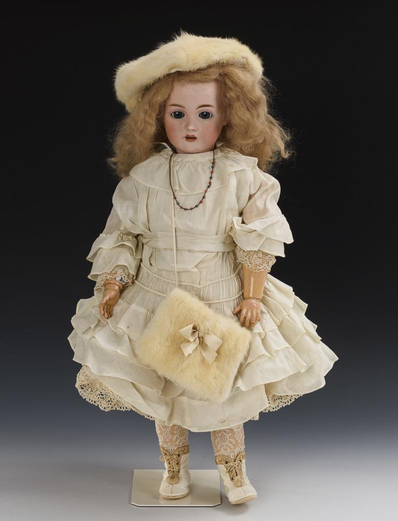 Kurbelkopf, blaue Schlafaugen, blonde Mohairperücke. 15-teiliger Gliederkörper. Helles Kleid, Fellmuff, weiße Mütze, weiße Lederschuhe. Kopf durchleuchtet: ohne Defekte, lediglich winzige Chips und 1 Brandriss an den Ohrlöchern. Körper übermalt, 2 Finger links repariert.