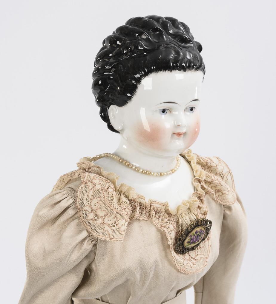 Brustkopf, gemalte blaue Augen, modellierte schwarze Haare, Lederkörper, weiße Biskuitarme. Langes, in alter Art nachgenähtes Kleid, weiße Haube, Perlenkette. Kleiner Chip an der Brustplatte vorn, Haarfarbe minimal berieben, Körper mit Altersspuren.