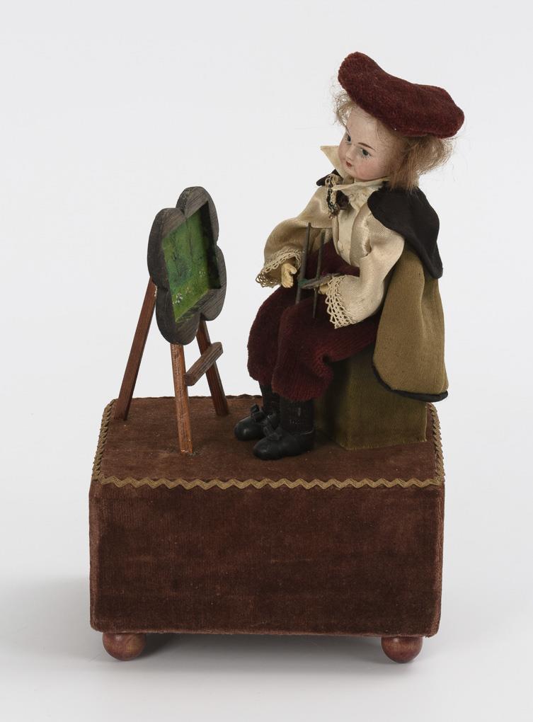 Porzellankopfpuppe in Kleidung eines Malers mit Staffelei. Auf Podest mit braunem Samtbezug und Spielwerk. Spielt Musik, bewegt dabei Kopf und Hände. Intaktes Werk mit festem Schlüssel. Leichte Altersspuren.