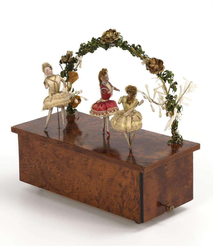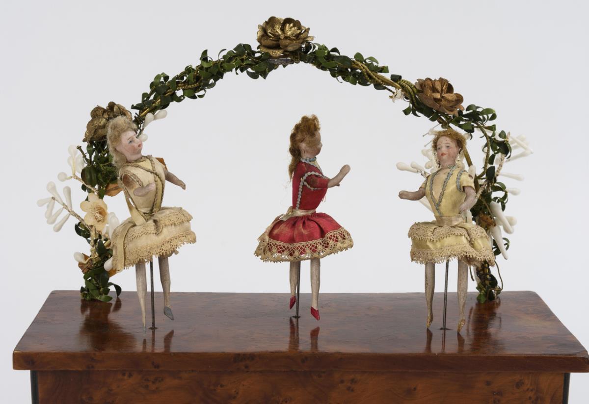 3 Püppchen mit Porzellanköpfen und -gliedern, sowie Blütenbogen auf furniertem Holzkasten. Werk intakt, mit festem Schlüssel. Kleine Furnierdefekte.