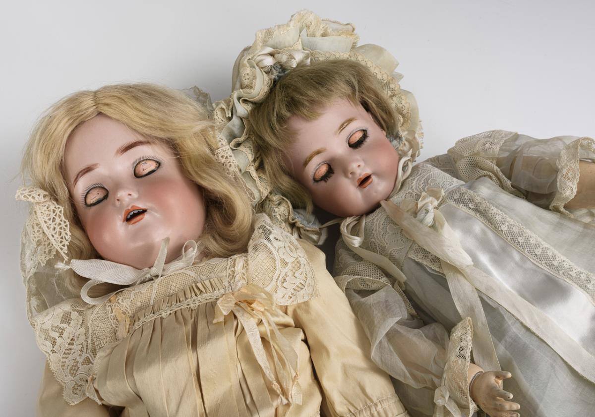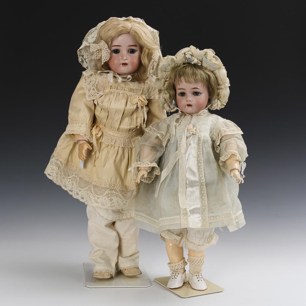 Beide mit Kurbelkopf, blauen Schlafaugen, blonder Mohairperücke, 15-teiligem Gliederkörper, hellem Kleid und Häubchen. Die kleinere mit Perückenpull und Haarriss am Hals vorne, die größere mit winzigem Chip am rechten Ohrläppchen. Körper mit kleinen Defekten, Reparaturen und Übermalungen.