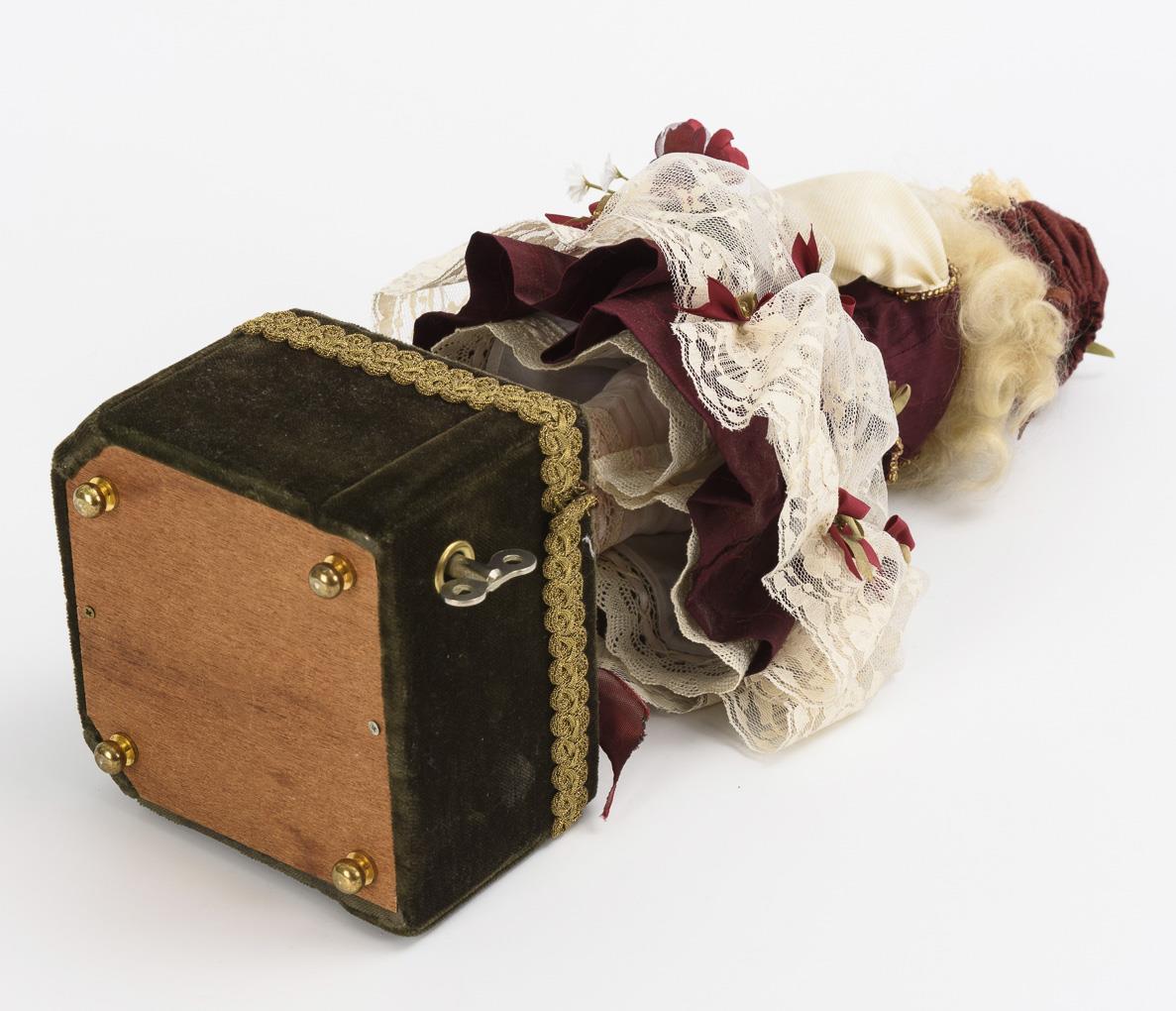 Blondes Puppenmädchen mit braunen Glasaugen und Mohairperücke. Auf samtbezogenem Kasten mit intaktem Spielwerk und festem Schlüssel.