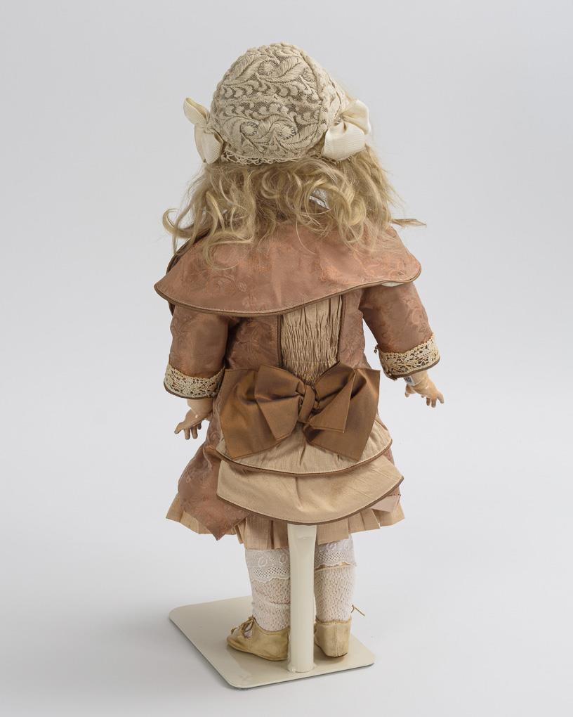 Kurbelkopf, blaue Schlafaugen, Wimpern, Ohrringe, jüngere Mohairperücke. 15-teiliger Gliederkörper. Altrosa Kleid in alter Art. Kopf durchleuchtet: ohne Defekte.