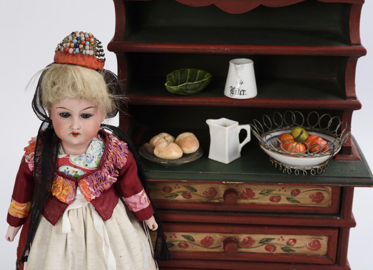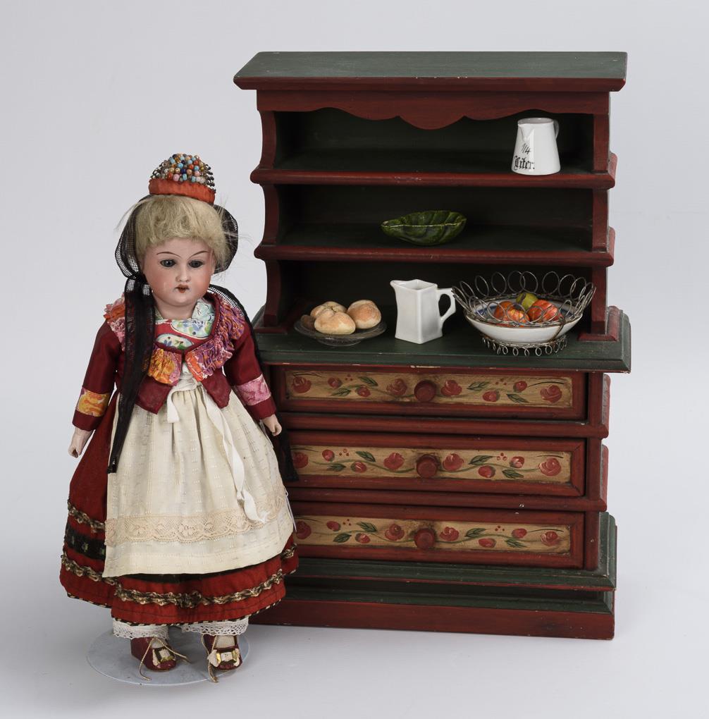 2 Puppen in Tracht und bäuerlicher Küchenschrank. Armand Marseille.
