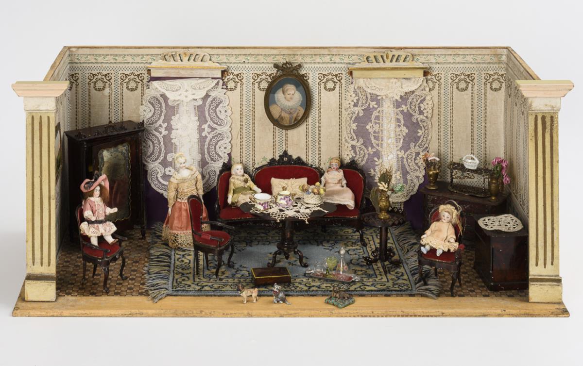 1-Raum-Gehäuse mit 2 verglasten Fenstern, Gardinen und Frontlisenen. Als eleganter Salon eingerichtet mit Blechmöbeln, 3 Wiener Bronze Tieren und 5 Püppchen. Altersspuren, 1 Fenster mit Sprung. Möbel mit Lackdefekten, teils mit Retuschen. 1 Bein vom Sofa geknickt, 1 Bein lose anbei.