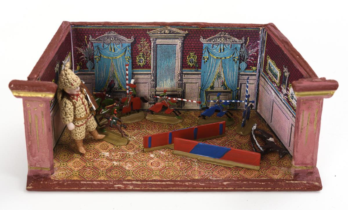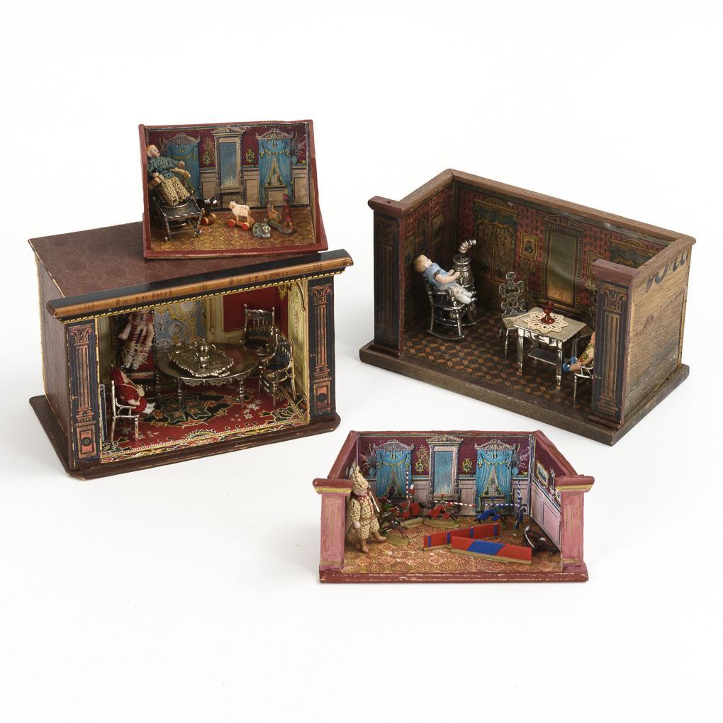 Aus Zigarrenkisten gebaute kleine Gehäuse mit farbigen Tapeten im alten Stil. 3x mit Miniatur-Möbeln aus Silber eingerichtet, 1x mit Zinnfiguren. Dazu insgesamt 6 Püppchen.
