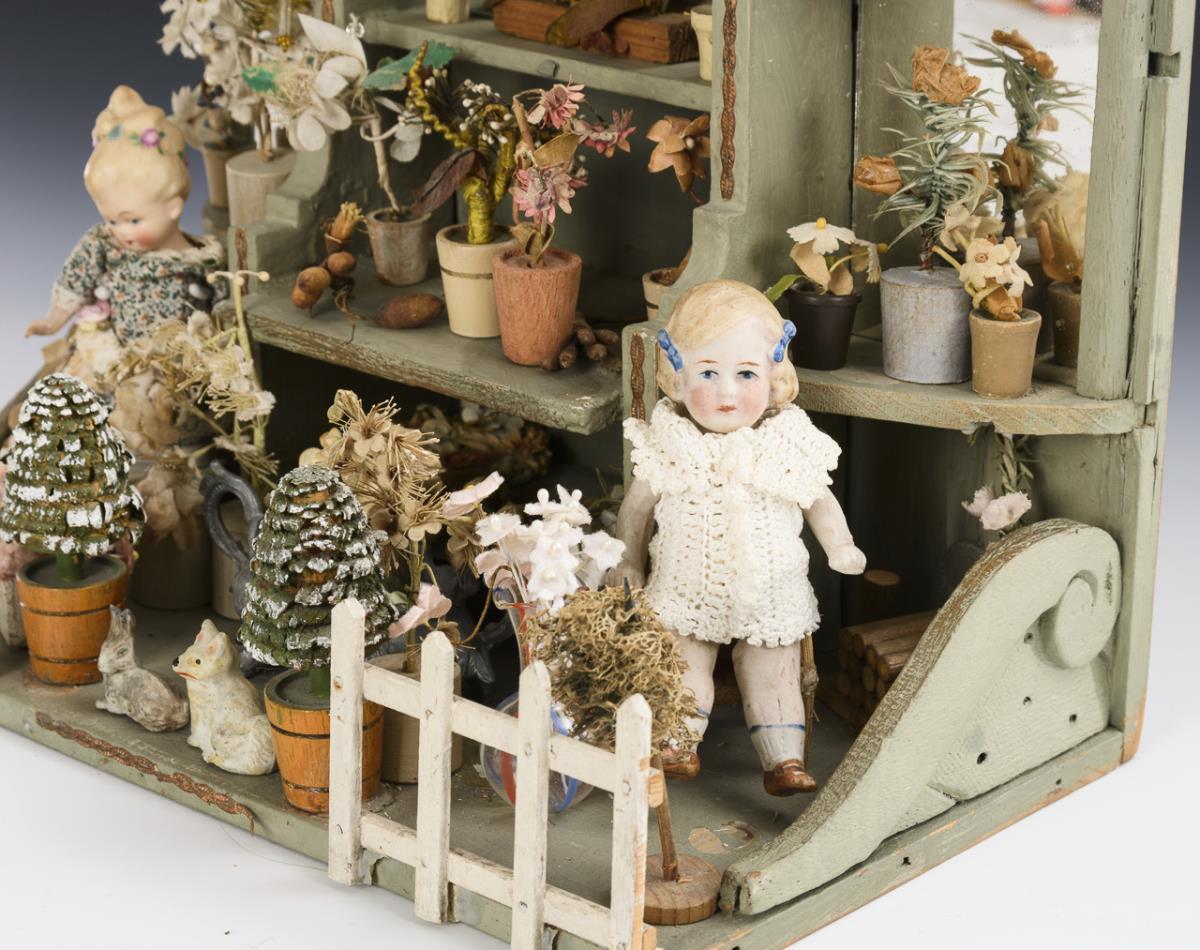 Offener Verkaufsstand mit fester Rückwand, Regal, 2 Spiegeln und kleinem Zaun vorn. Eingerichtet als Blumenladen mit zahlreichen Textilblumen und verschiedenen Bäumchen. Dazu 2 Ganzbiskuit-Püppchen (1x wohl jünger). Altersspuren, kleine Defekte an den Pflanzen.