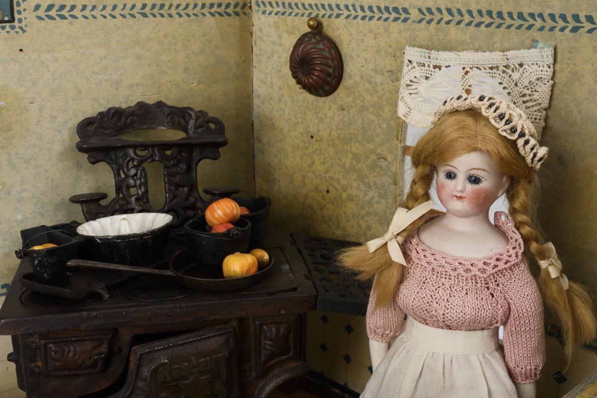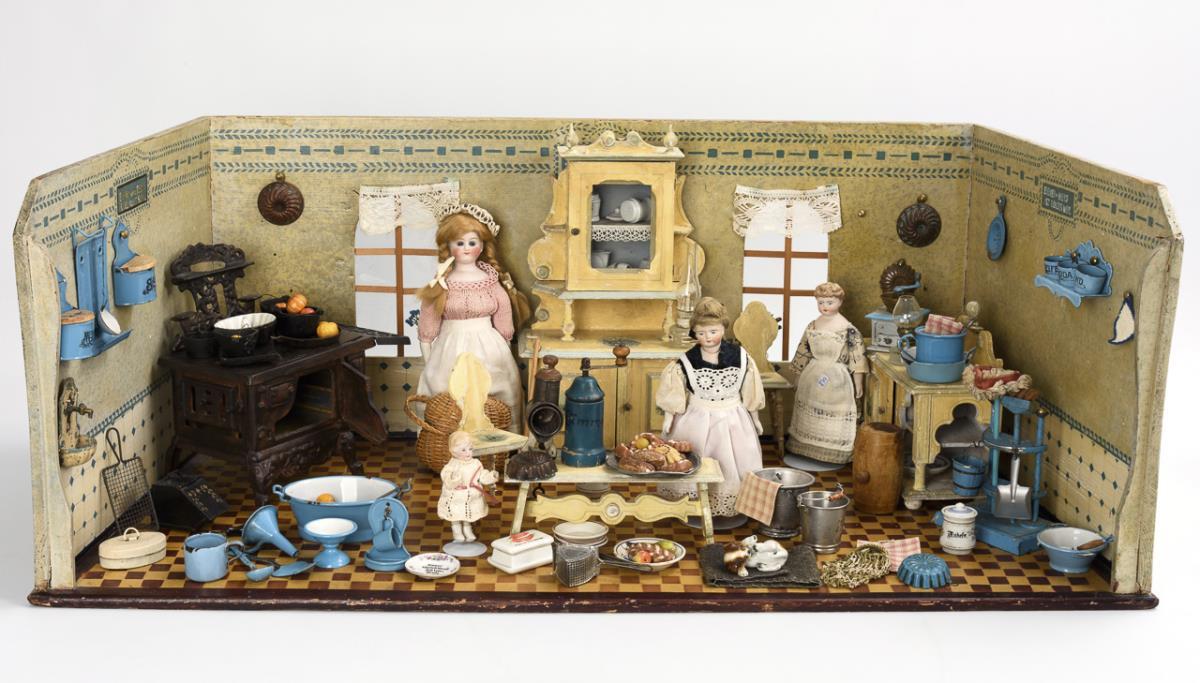 Trapezförmiges 1-Raum-Gehäuse mit 2 verglasten Fenstern und nachträglich angebrachten Streben. Eingerichtet mit Gußeisen-Herd "Rescent" im alten Stil und weißen Möbeln mit Delfter Dekor. Dazu zahlreiches Zubehör: Ausguss, Wandmeste, blau emailliertes Blech und 4 Püppchen (2x Brustkopf, 1x Kurbelkopf auf Brustplatte und 1x Ganzbiskuit). Bespielt, Altersspuren und Farbdefekte.