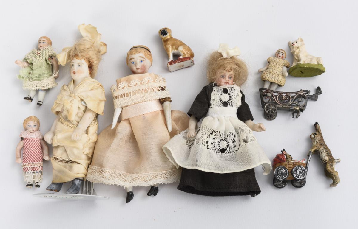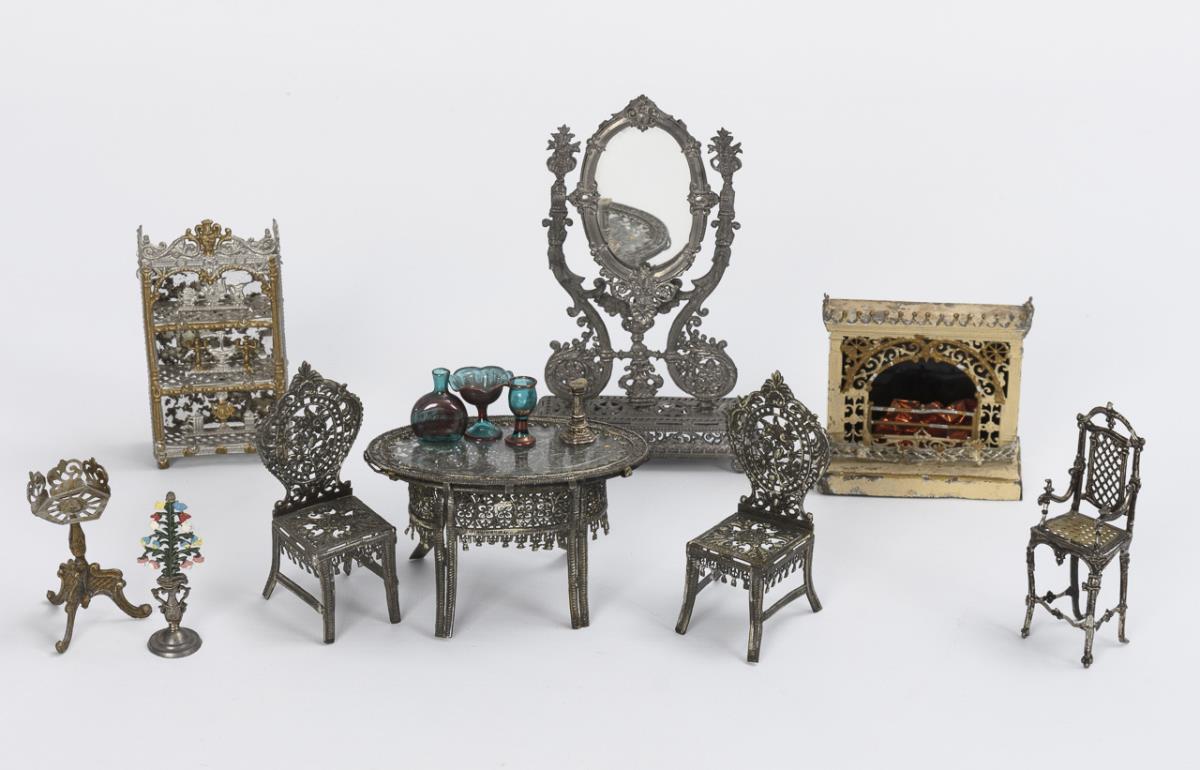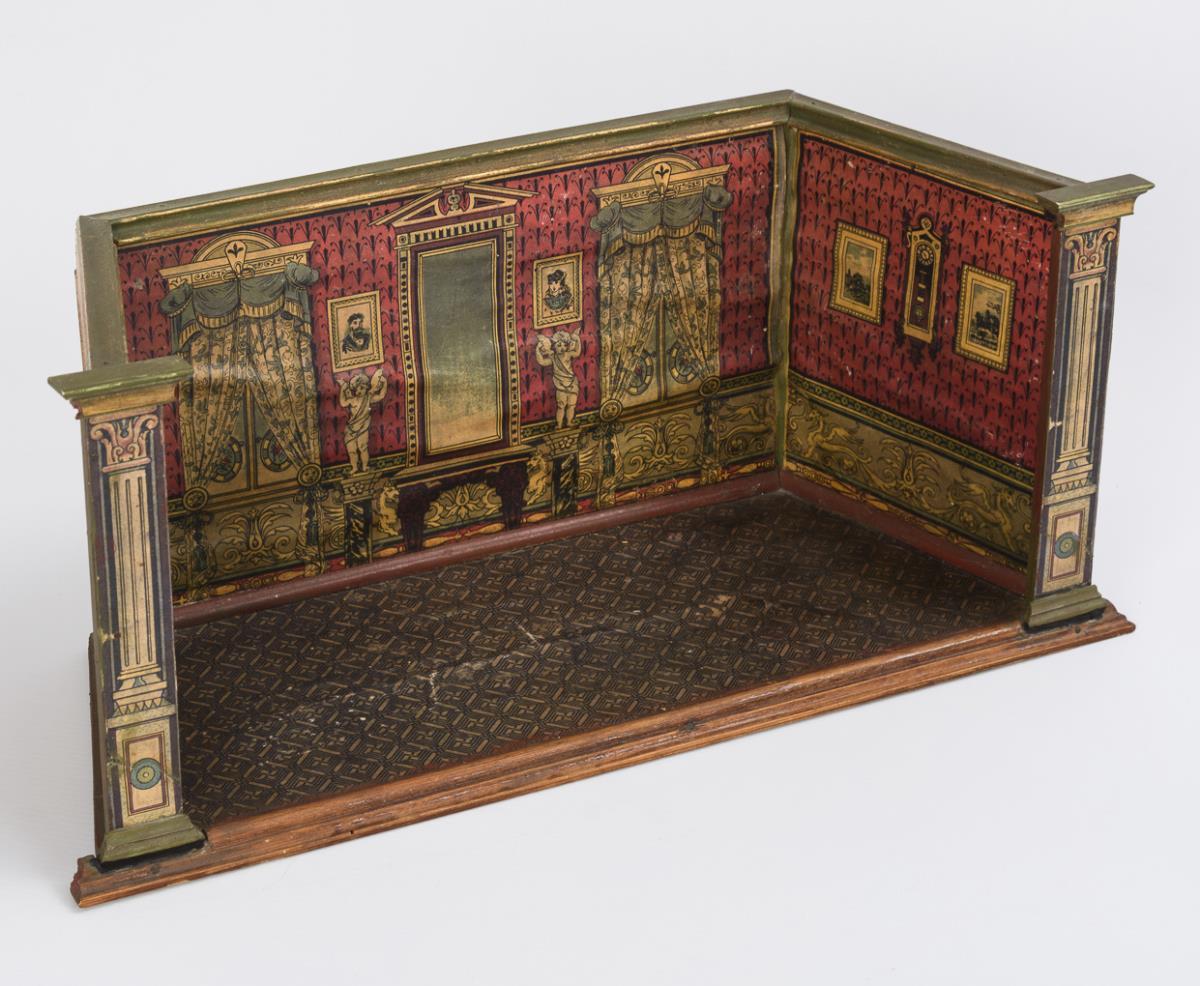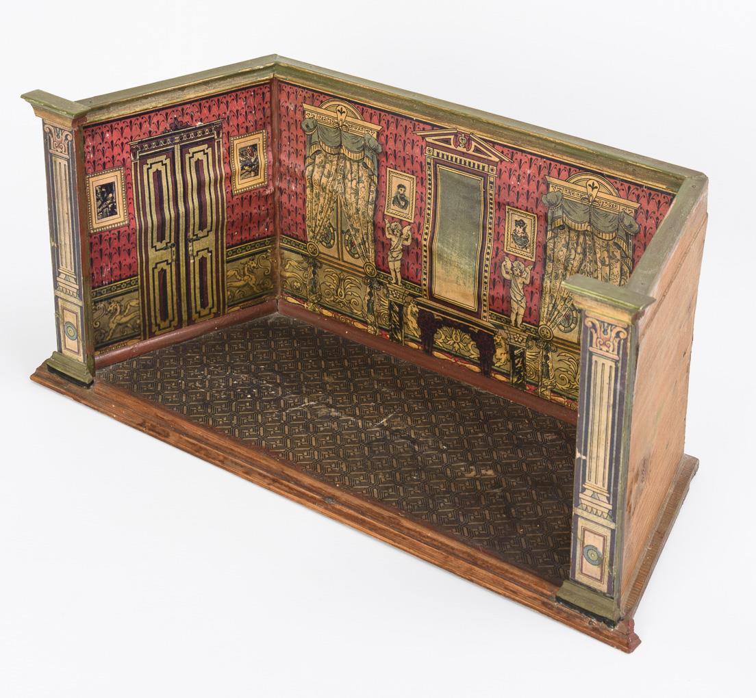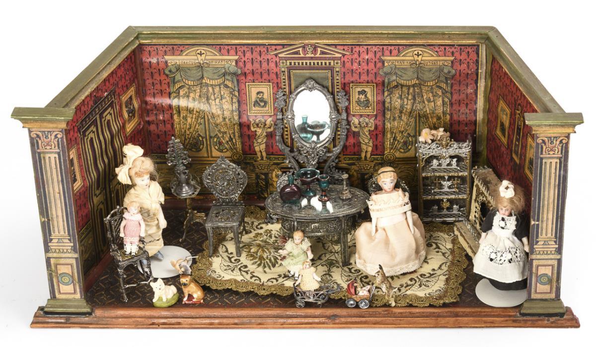 Trapezförmiges 1-Raum-Gehäuse mit Filigranmöbelchen aus Zinn, Blechkamin, 3 Puppenstubenpüppchen sowie 3 Kindern, Tieren etc. Altersspuren, kleine Defekte.