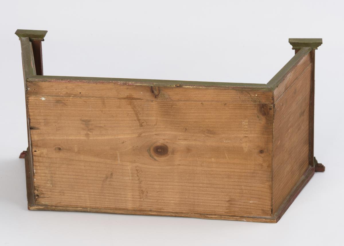 Holz, innen wohl nachtapeziert, mit aufgedruckten Fenstern und Tür. 19 x 43,5 x 17 cm.