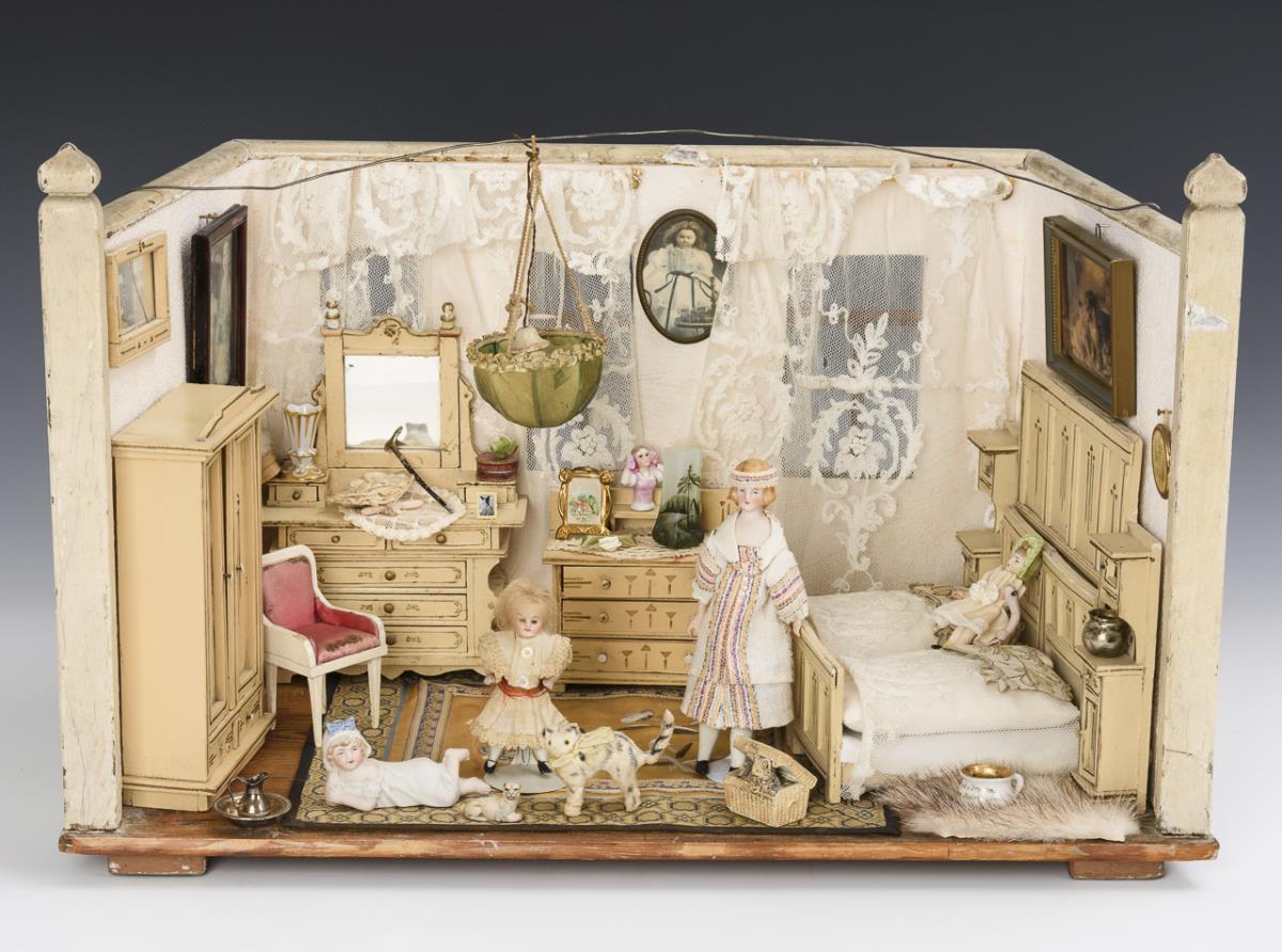 Trapezförmiges 1-Raum-Gehäuse mit 3 Fenstern, Gardinen und Deckenlampe. Eingerichtet mit 4 originalen, cremefarbenen Manufakturmöbeln: Doppelbett, Kleiderschrank, Kommode und Frisiertisch. Dazu 3 Püppchen, kleines Pianobaby und zahlreiches Zubehör. Altersspuren, Außenanstrich partiell abgeblättert, 1 Sprung im Glas, Möbel teils nachgestrichen.