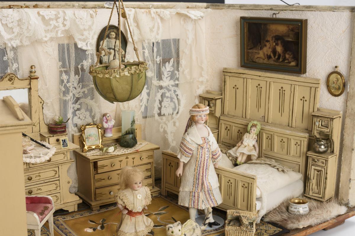 Trapezförmiges 1-Raum-Gehäuse mit 3 Fenstern, Gardinen und Deckenlampe. Eingerichtet mit 4 originalen, cremefarbenen Manufakturmöbeln: Doppelbett, Kleiderschrank, Kommode und Frisiertisch. Dazu 3 Püppchen, kleines Pianobaby und zahlreiches Zubehör. Altersspuren, Außenanstrich partiell abgeblättert, 1 Sprung im Glas, Möbel teils nachgestrichen.
