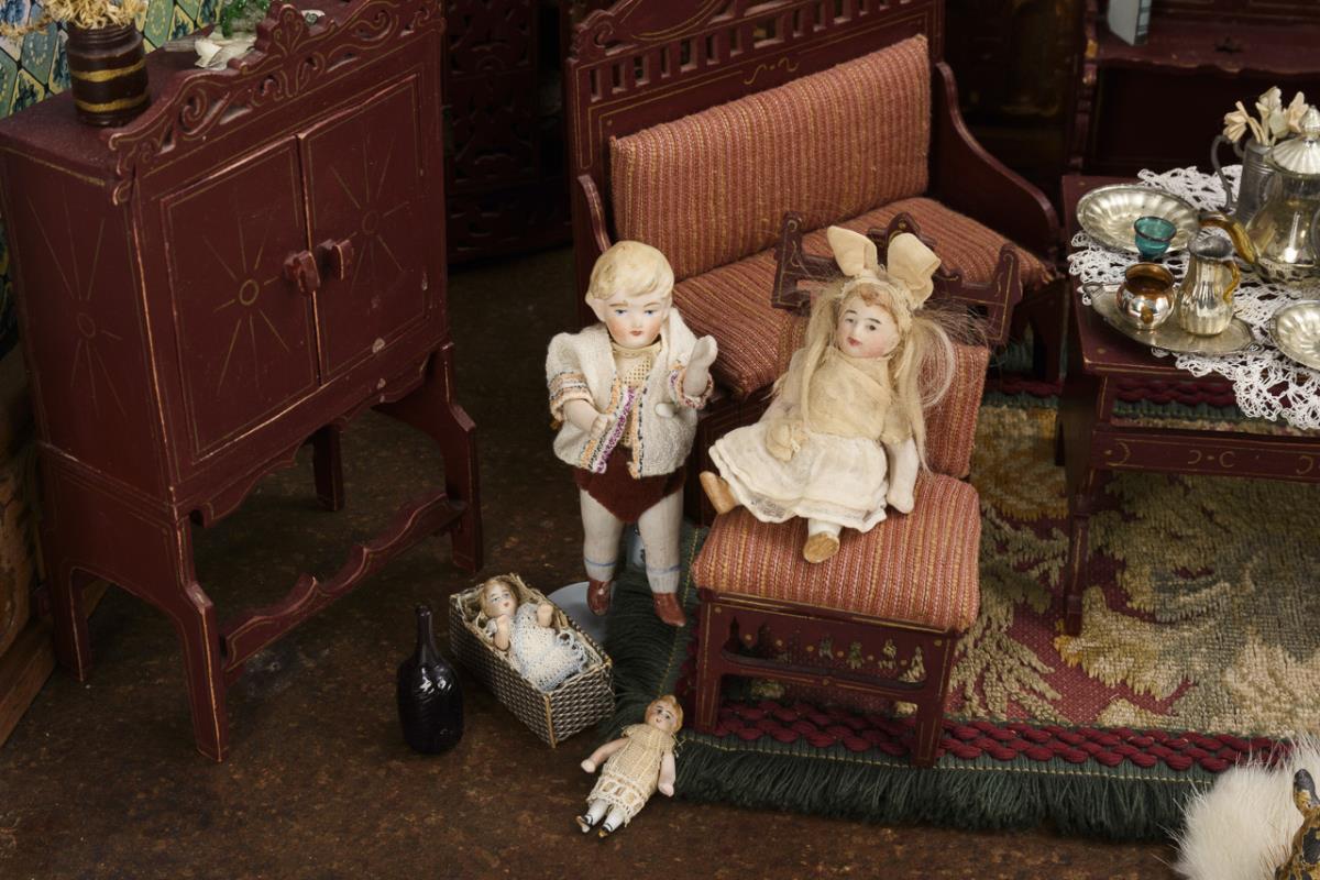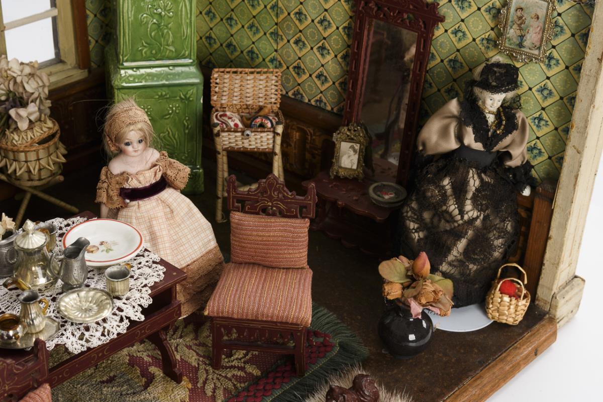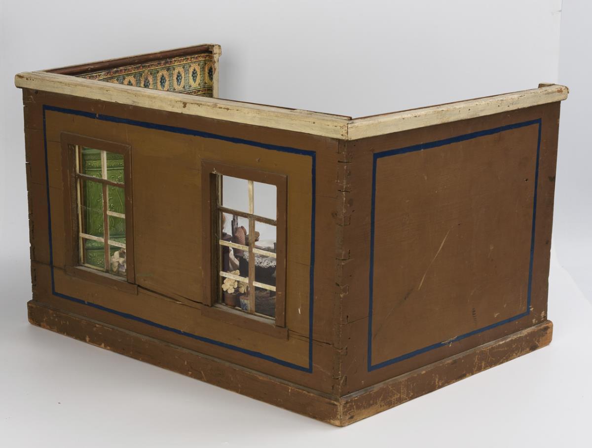 Trapezförmiges 1-Raum-Gehäuse mit 2 Fenstern. Eingerichtet als Wohnstube mit 8 rotbraun gestrichenen Möbeln, grünem Keramikofen, zahlreichem Zubehör und 5 Püppchen. Wohl nachgearbeitet, Gehäuse mit Trockenrissen, 1 Fensterstrebe fehlt. Ofen mit 1 Glasurabplatzer.