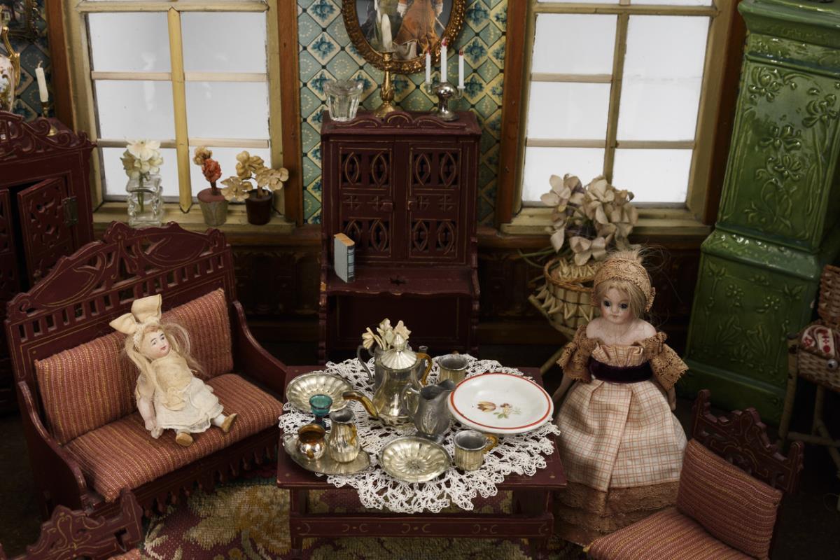 Puppenstubensalon mit Jugendstil-Kachelofen.