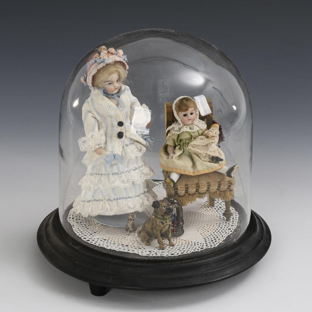 Puppenstubendame mit Brustkopf und Ganzbiskuitmädchen mit gesplinteten Gliedern auf Stuhl sitzend. Dazu Püppchen, Vogelbauer, Katze und Mops (1x Wiener Bronze, FBW). Glassturz mit schwarzem Sockel auf 3 Füßchen. Mädchen mit Chip am Beinansatz, Glassturz mit ungeschliffener Kante.