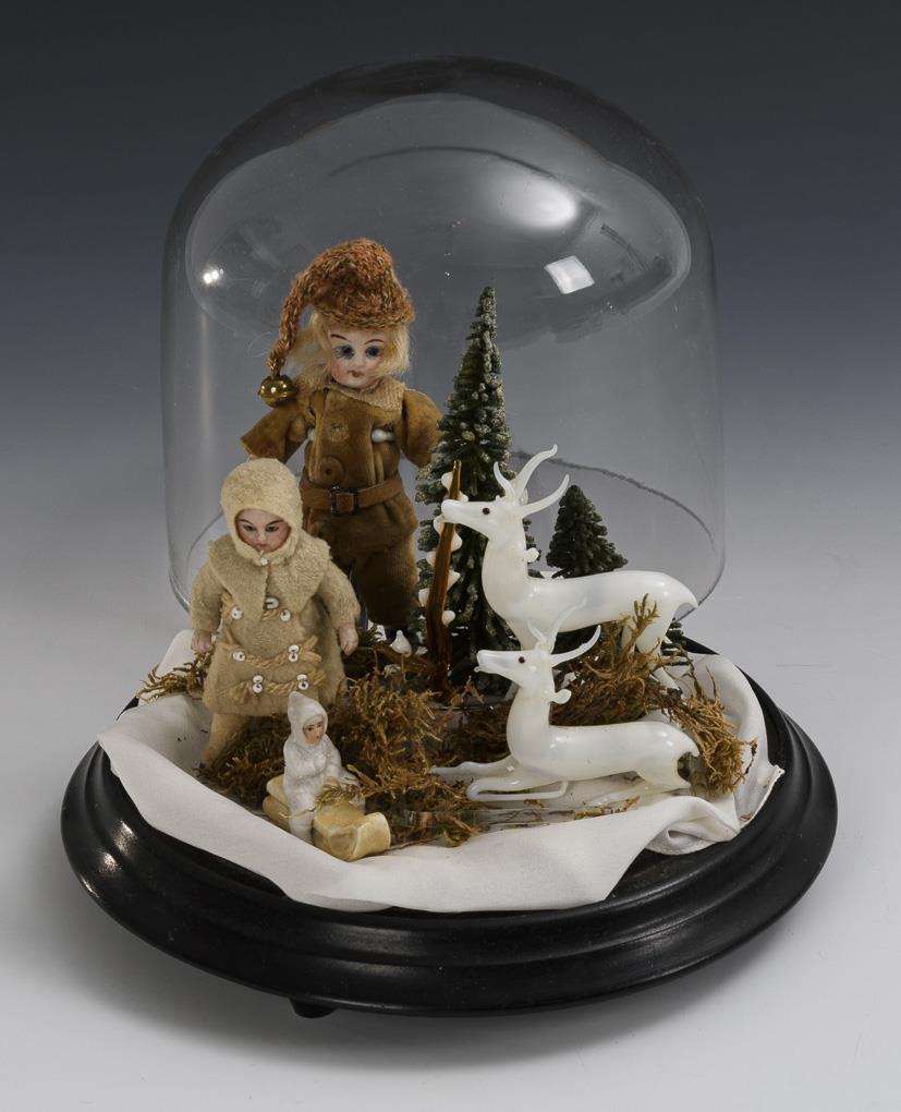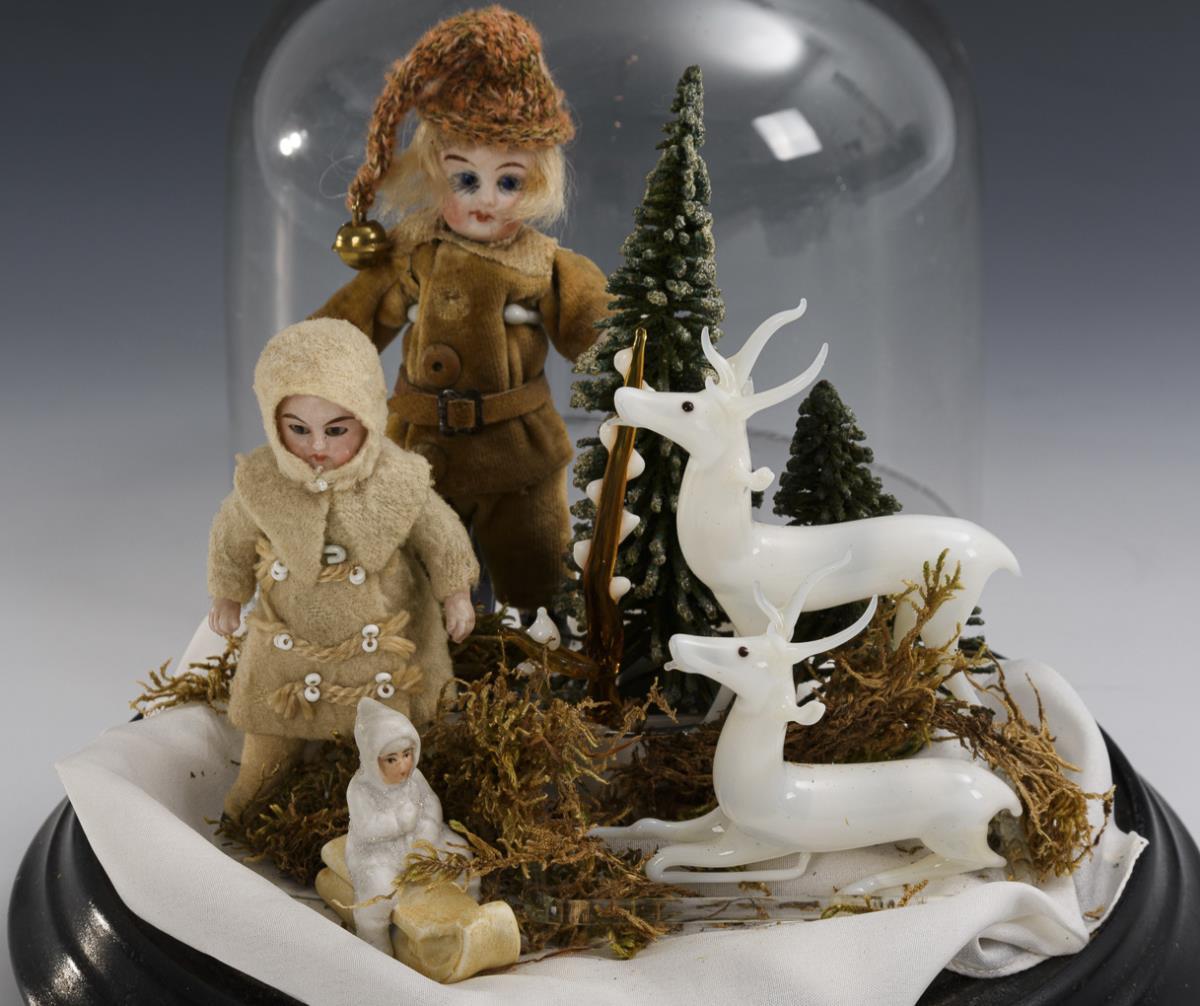 Kleine Winterlandschaft mit 2 Püppchen, Schneekind und Hirschen unter Glassturz.