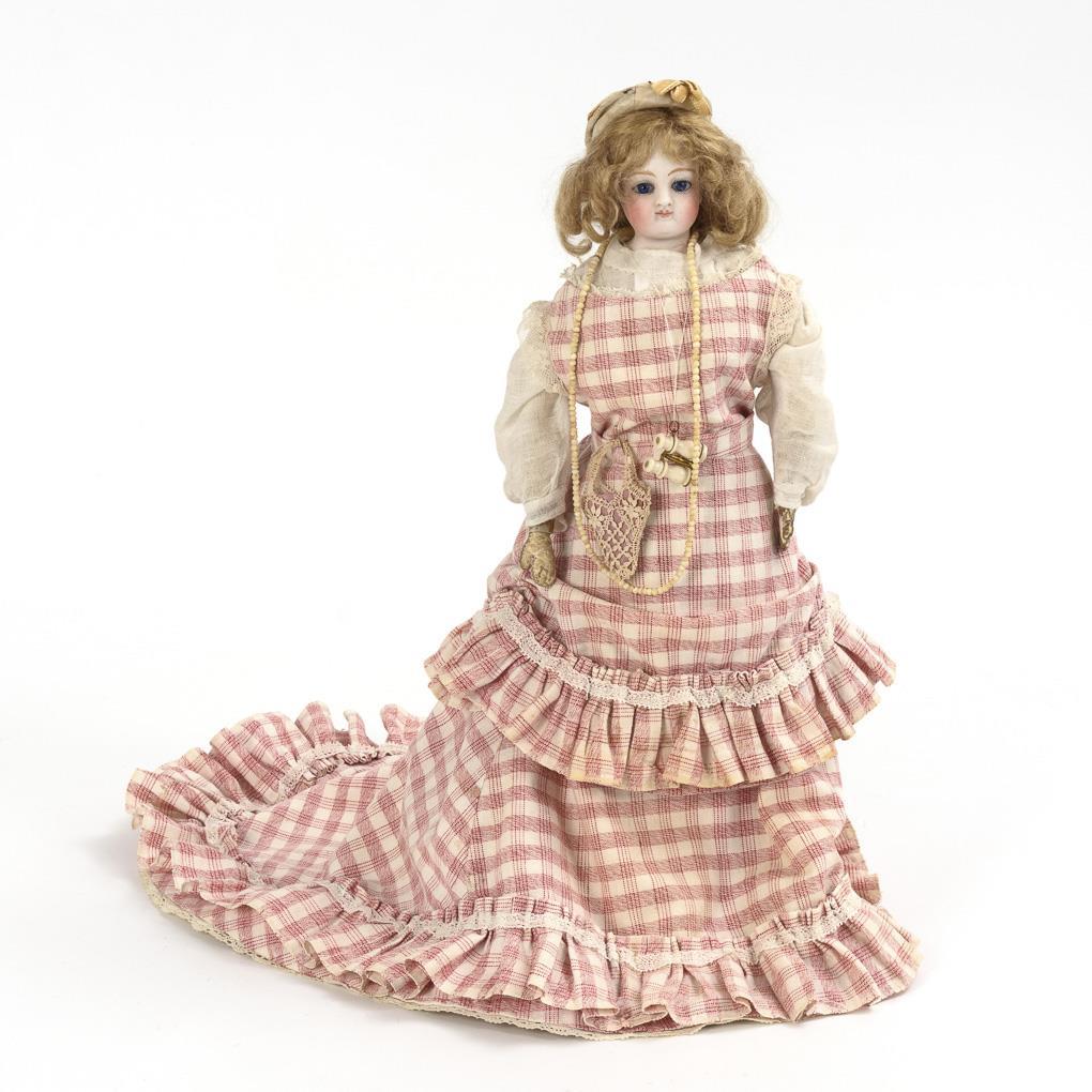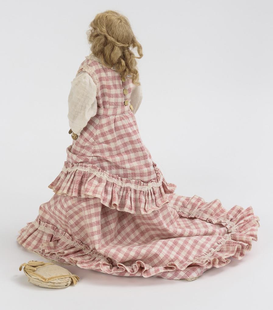 Feste blaue Glasaugen, geschlossener Mund, blonde Mohairperücke. Schlanker Lederkörper. Helles Kleid mit rot-kariertem Muster, weißes Hütchen. 2 kleine Brandrisse an Hals und Rücken, Arme repariert.