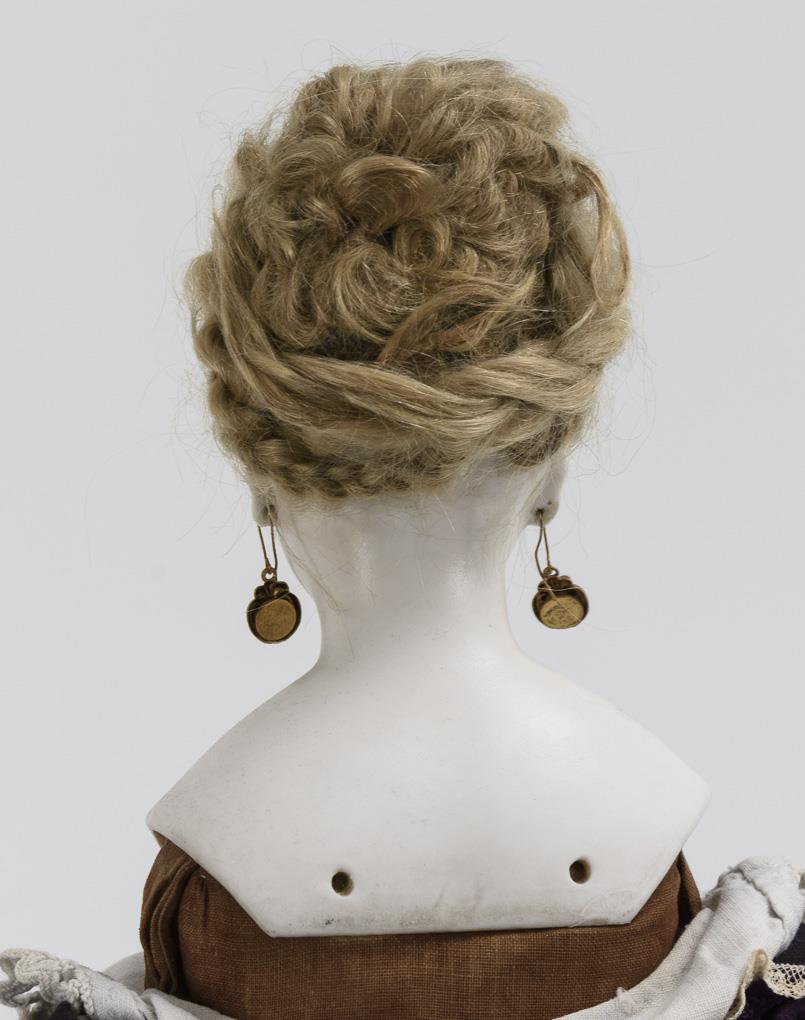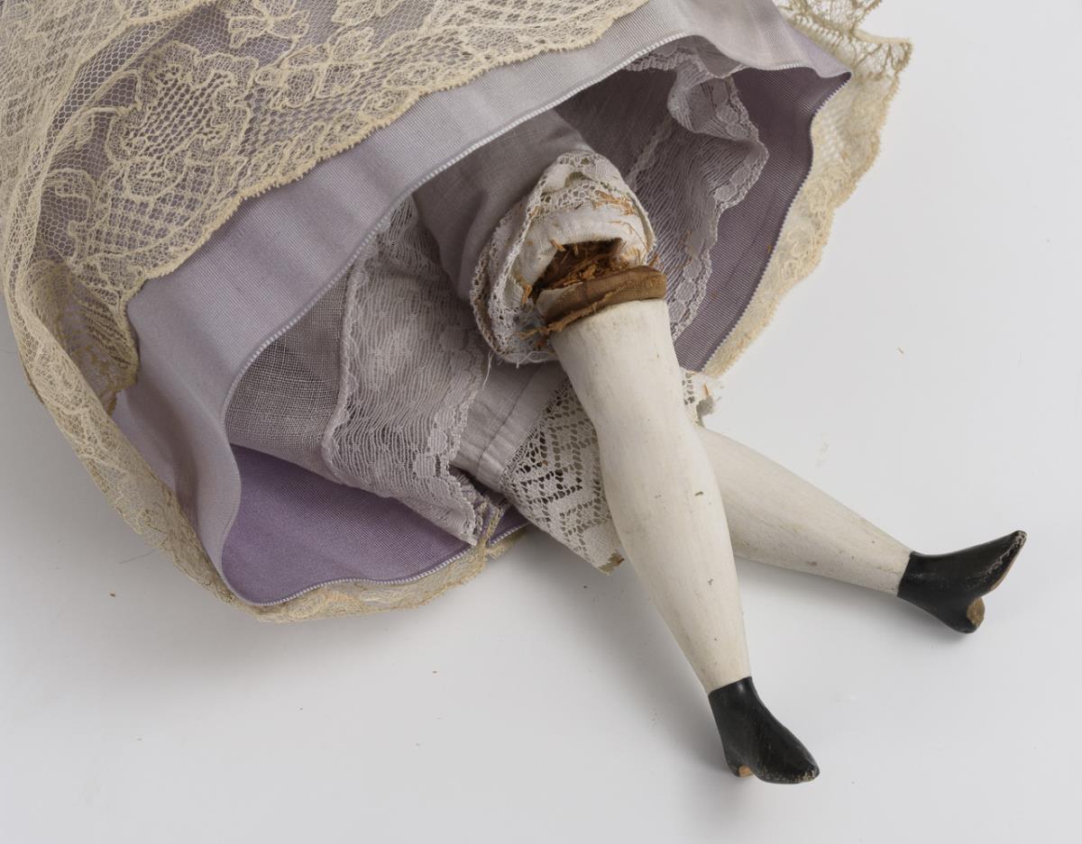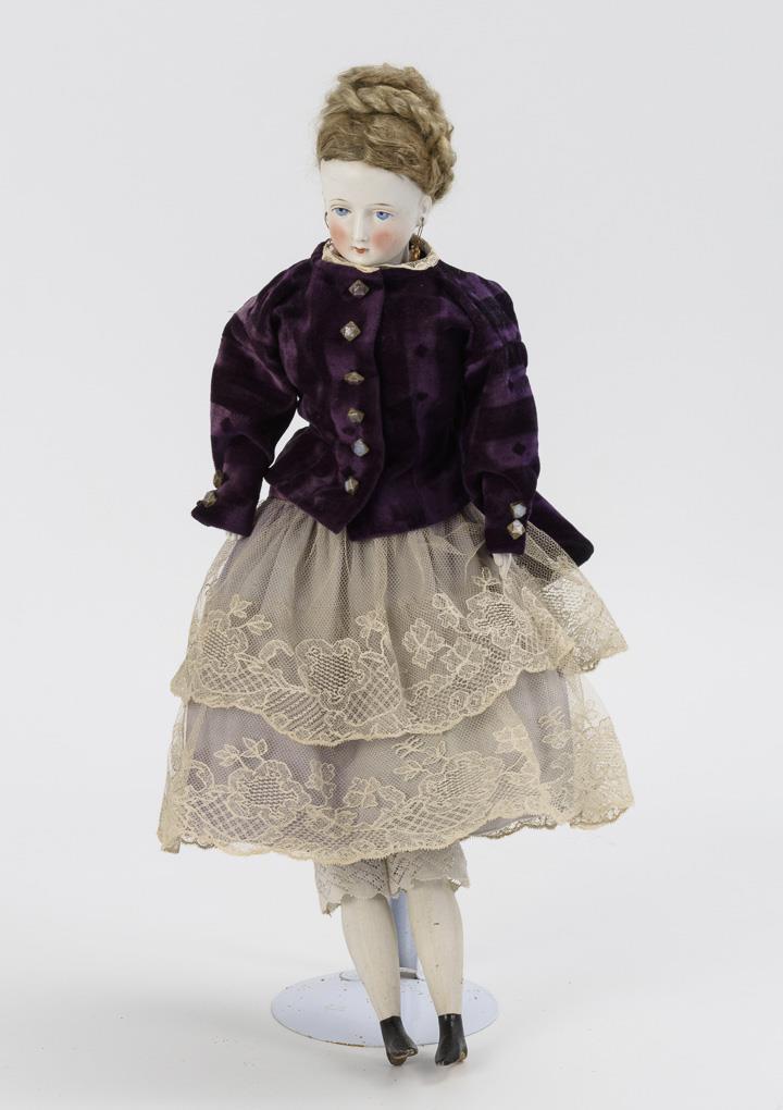Heller Pariankopf, gemalte blaue Augen, Ohrringe, blonde Mohairperücke mit Flechtfrisur. Stoffkörper mit Biskuitgliedern und modellierten, schwarzen Schuhen. Heller Tüllrock, Samtjacke. Körper mit Defekten (rieselt!), 2 Glieder fast lose.