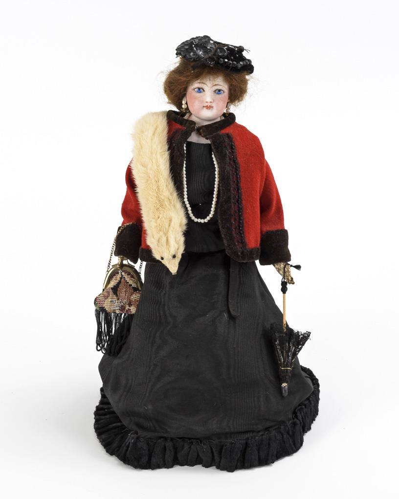 Brustkopf, gemalte blaue Augen, braune Mohairperücke, fester Korkdeckel. Schlanker Lederkörper mit Zwickeln an Ellbogen, Knien und Po. Schwarzes Kleid, rote Jacke, weißer Pelzschal. Kopf nicht durchleuchtet: keine Defekte sichtbar. Hände berieben.
