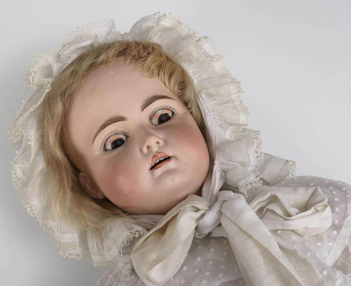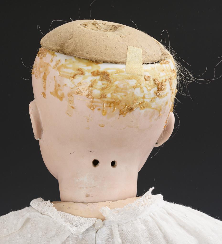 Kurbelkopf, braune Schlafaugen, Ohrlöcher, defekte blonde Mohairperücke. 15-teiliger Gliederkörper. Langes weißes Kleid, Haube, braun-weiße Kinderschuhe aus Leder. Kopf durchleuchtet: ohne Defekte, lediglich kleine Chips an den Ohrlöchern. Körper mit kleinen Farbdefekten und 2 geklebten Fingern.