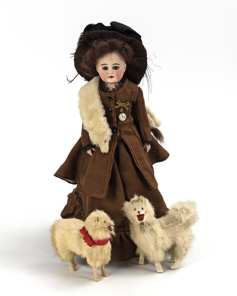 Feste blaue Glasaugen, offener Mund, Ohrlöcher, braune Mohairperücke. Lederkörper mit Zwickeln an Ellbogen, Po und Knien, Unterarme aus Biskuit. Braunes Kostüm, weiße Pelz-Stola, Hut mit Federschmuck, L 39 cm. Dazu 2 Hunde mit weißem Echtfell, H 13/14 cm. Kopf durchleuchtet: ohne Defekte. Hunde mit angebrochenen Beinen.