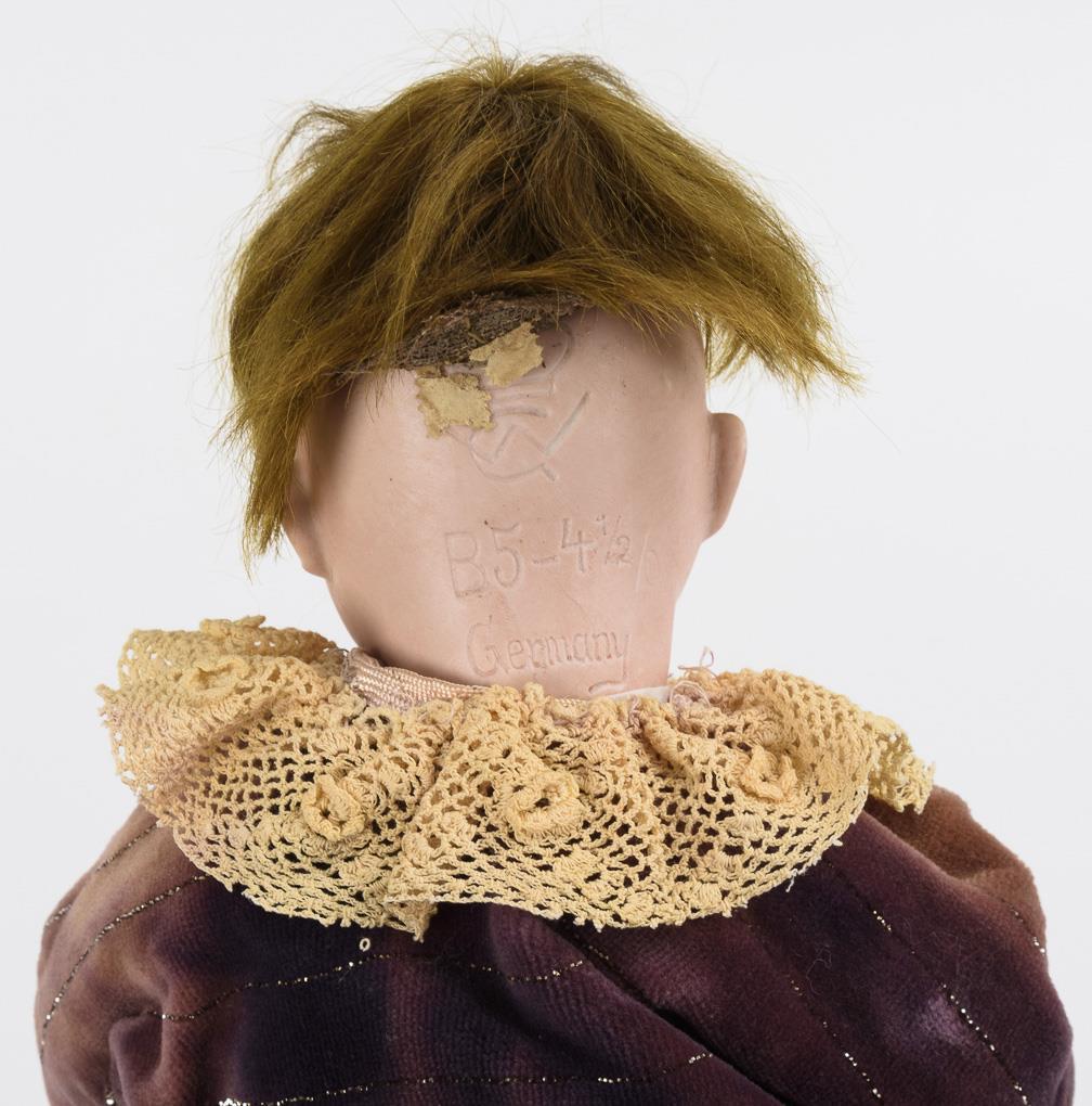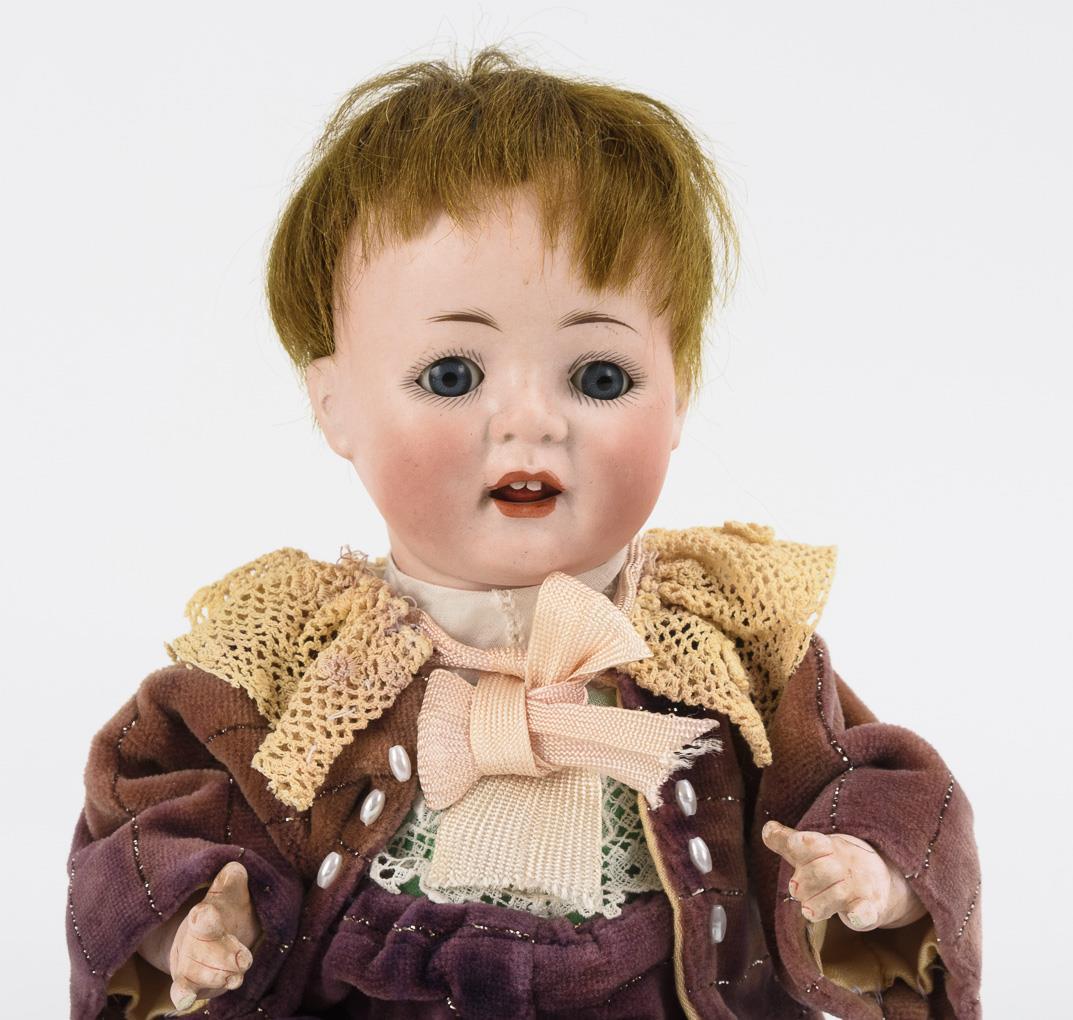 Kurbelkopf, blaue Schlafaugen, bewegliche Zunge, gelb-blonde Mohairperücke. 5-teiliger Sitzbabykörper. Violetter Samtanzug mit Silberfäden, schwarze Wachstuchschuhe. Kopf nicht durchleuchtet: keine Defekte sichtbar. Linke Hand angebrochen.