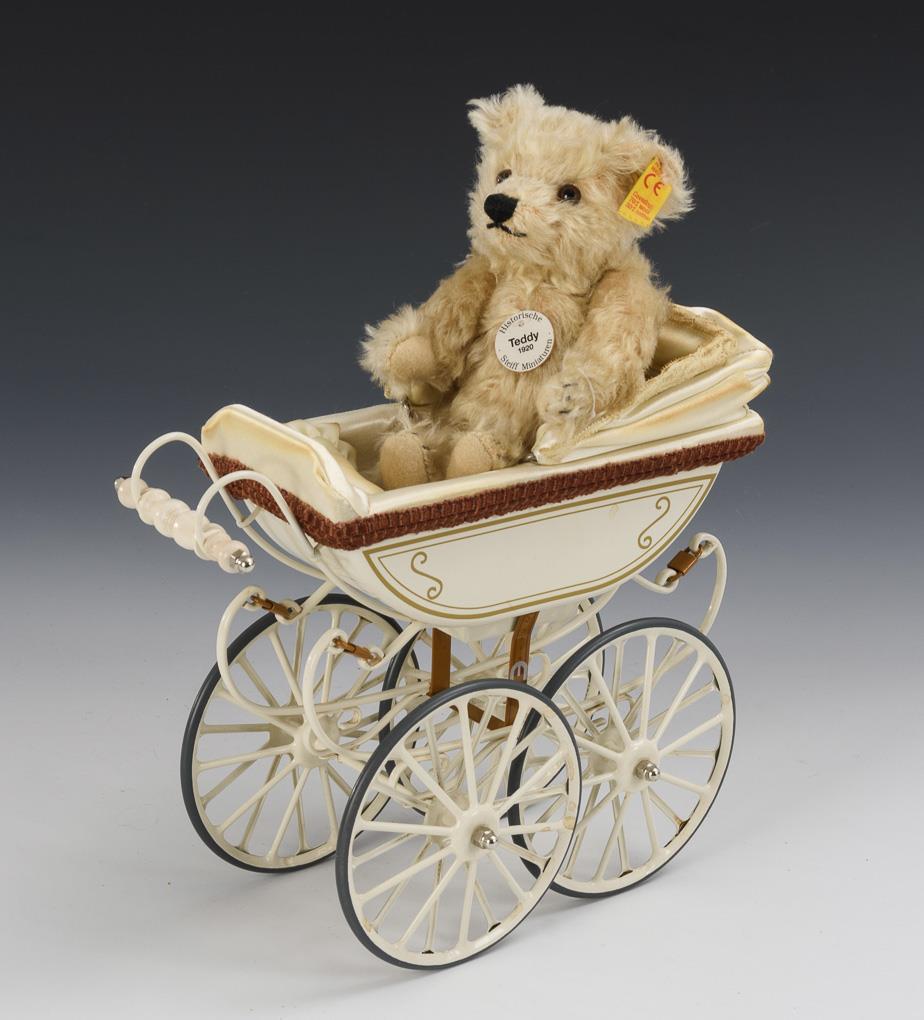 2 Puppen, Steiff-Teddy und Märklin-Puppenwagen. Ernst Heubach und Armand Marseille.