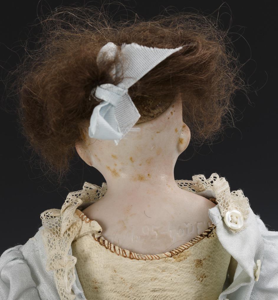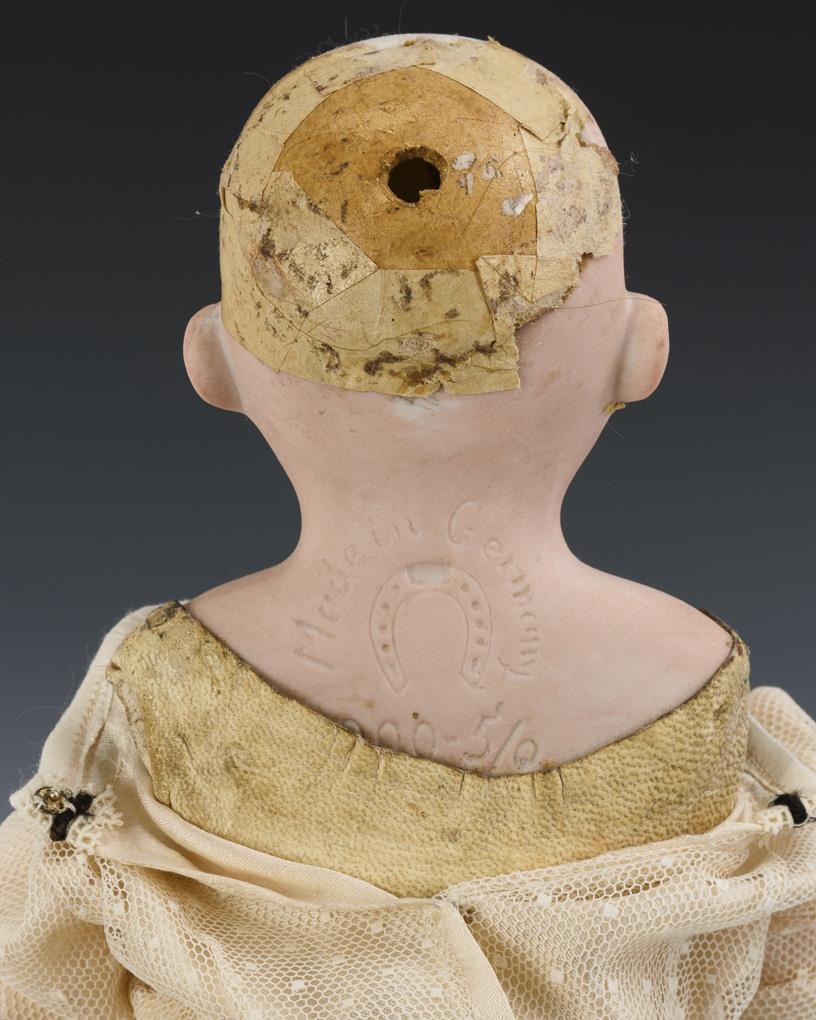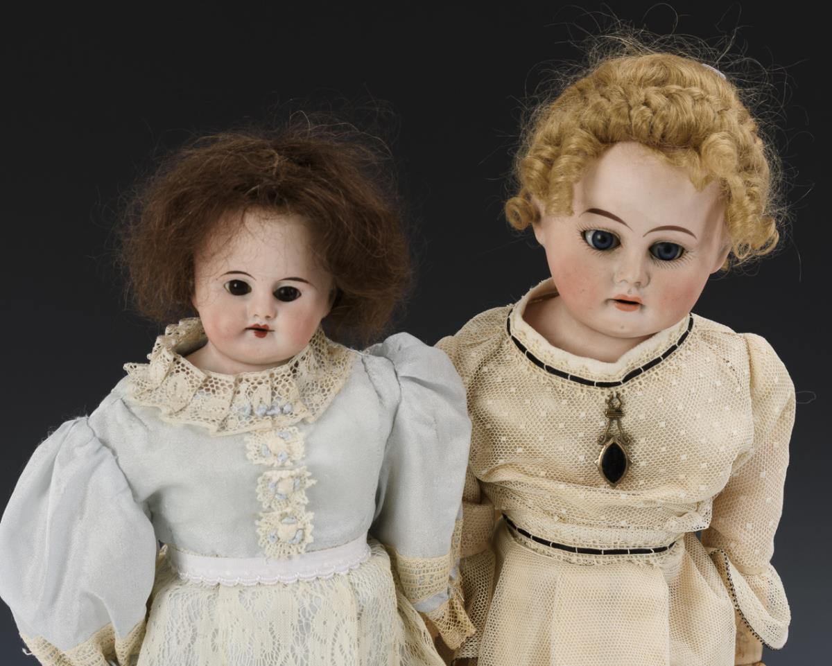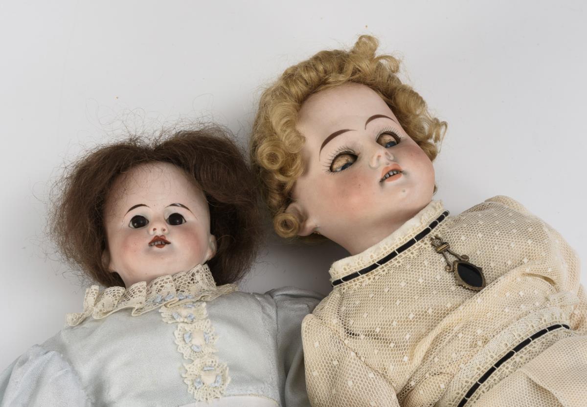 Beide Puppen mit Brustkopf, Glasaugen, Mohairperücke und Lederkörper. 1x in hellblauem Kleid mit Porzellanunterarmen (L 39 cm), 1x in weißem Kleid mit Gliederarmen (L 41 cm). Dazu Steiff-Teddy-Replik "Historische Steiff Miniaturen Teddy 1920" (L 15 cm) und weiß lackierter Blech-Puppenwagen mit weißem Satin-Verdeck, Märklin Replik von 1995 (L 21 cm). Köpfe nicht durchleuchtet: keine Defekte sichtbar.