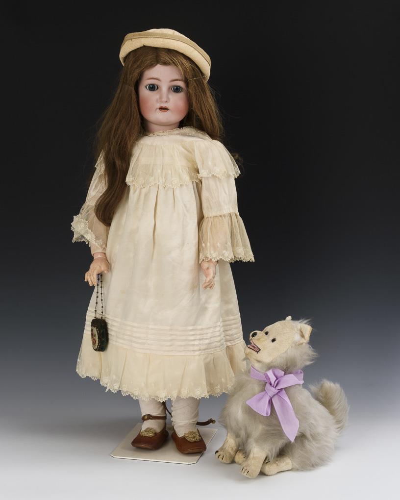 Kurbelkopf, blaue Schlafaugen, Ohrringe, lange mittelblonde Echthaarperücke. 17-teiliger Gliederkörper. Weißes Seidenkleid, cremefarbene Kappe, braune Lederschuhe, kleine Handtasche. Dazu weißer Plüschhund mit violetter Halsschleife. H 28 cm. Kopf durchleuchtet: ohne Defekte: lediglich winzige Chips an den Ohrläppchen.