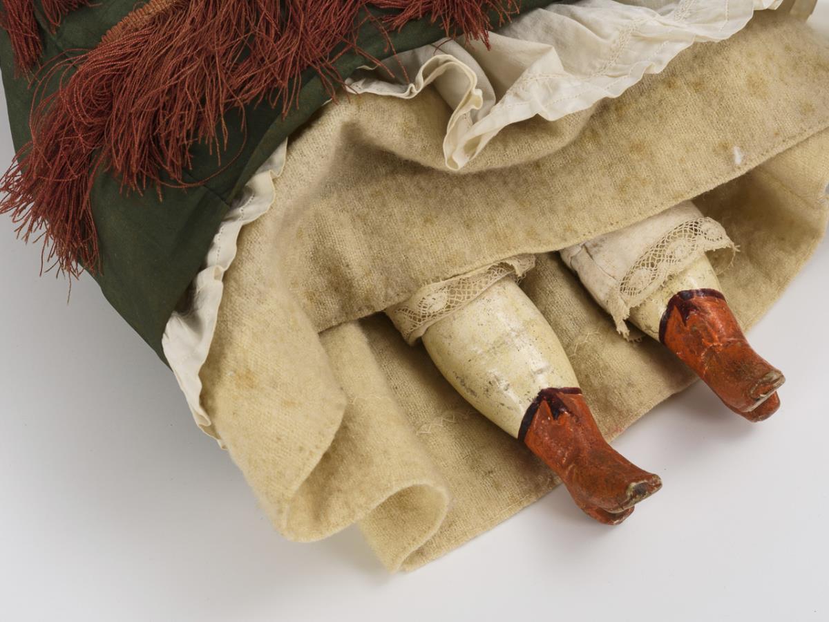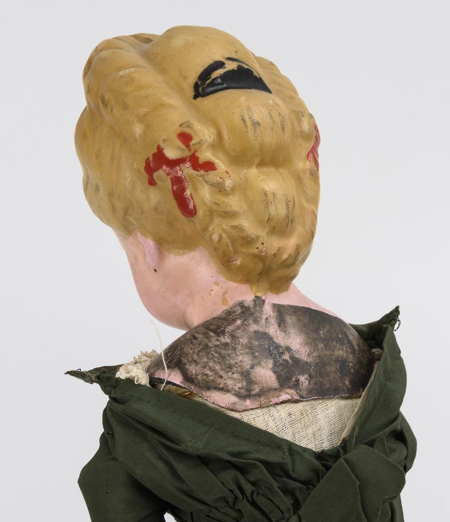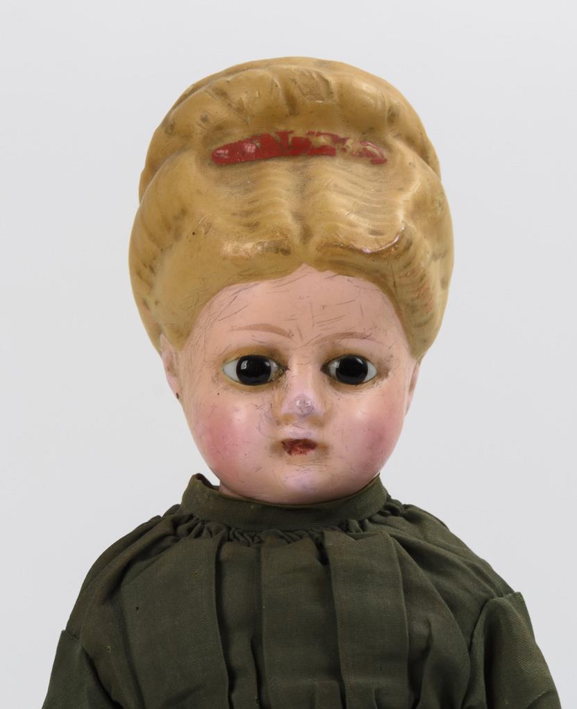 Modellierter Kopf aus Papiermaché, braune Glasaugen, blonde Hochsteckfrisur. Stoffkörper mit Massegliedern. Langes dunkelgrünes Kleid, modellierte Stiefelchen. Altersspuren, Kopf mit leichten Kratzern und partiellem Farbabrieb.