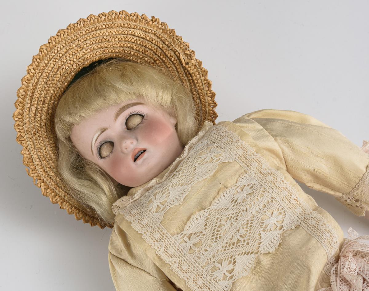 Braune Schlafaugen, blonde Mohairperücke, Stoffkörper mit Biskuitgliedern, cremefarbenes Seidenkleid, Strohhut, weiße Schuhe. Kopf durchleuchtet: ohne Defekte, rechtes Bein mit geklebtem Defekt.