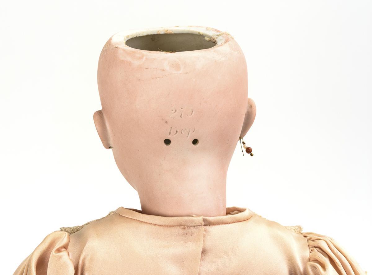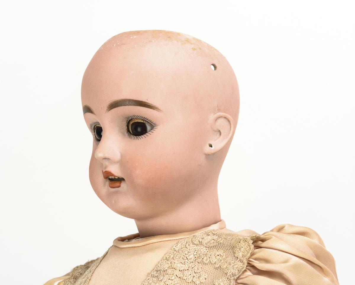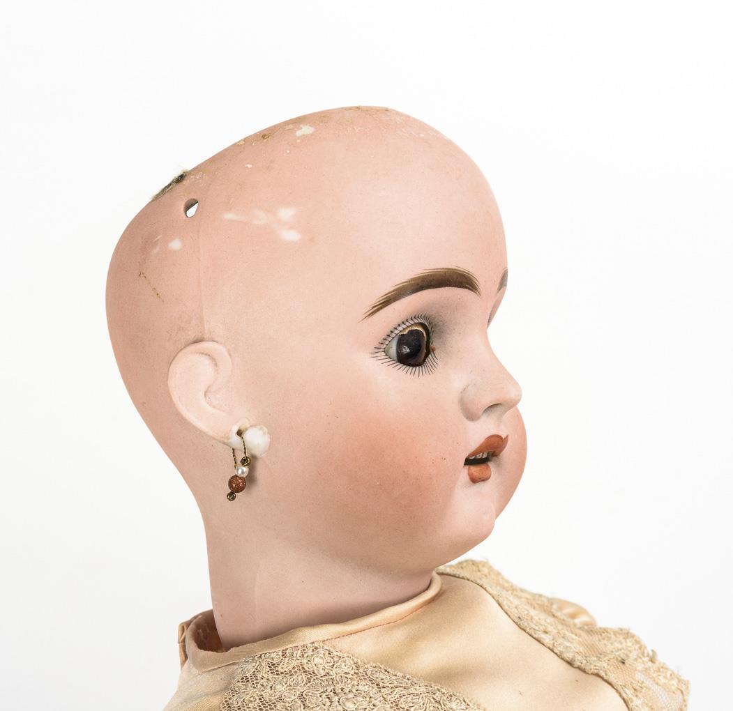 Kurbelkopf, braune Schlafaugen, 1 Ohrring, blonde Mohairperücke. 11-teiliger Gliederkörper. Hellrosa Seidenkleid. Kleine Reparatur am rechten Ohrläppchen, minimaler Perückenpull. 1 Finger geklebt.